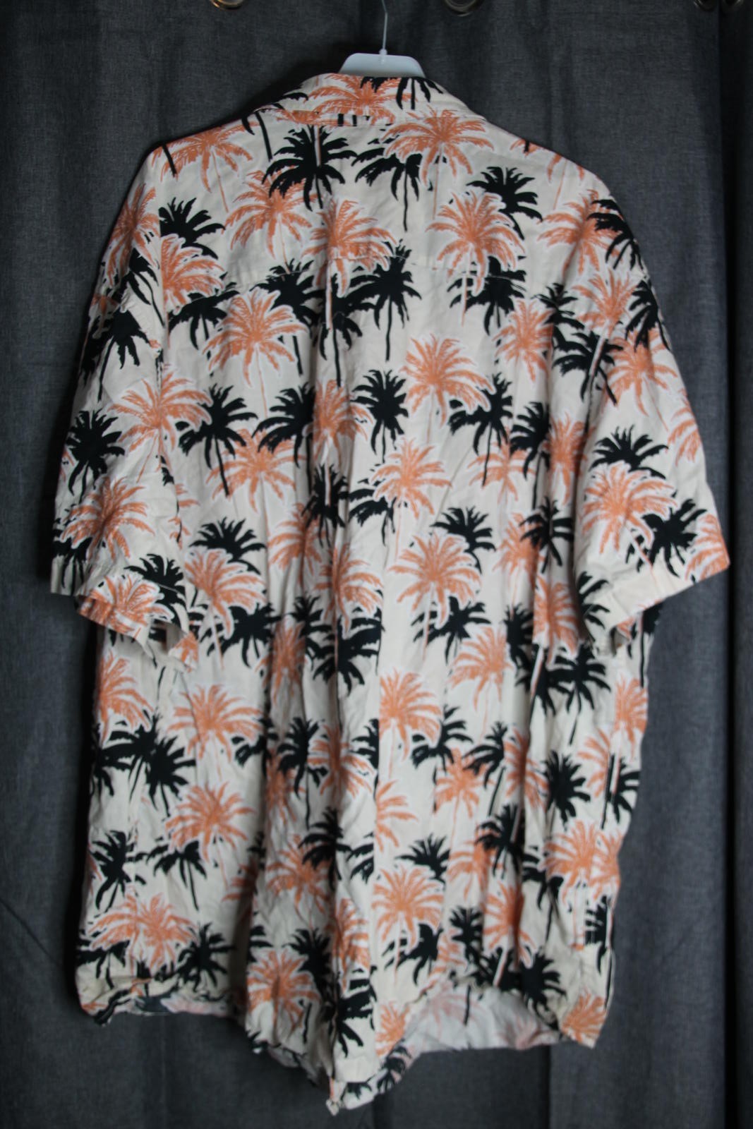 Stay cool and stylish with this vibrant tropical print shirt featuring black and peach palm trees on a light background. Perfect for summer days or casual outings. Lightweight and breathable fabric ensures comfort all day long. Size: EU 5XL / UK 3XL / US 3XL. Great addition to your casual wardrobe!