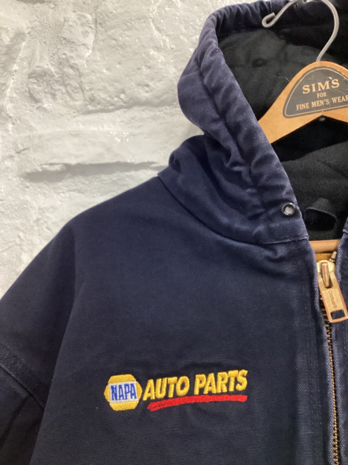 Nice Men's Carhartt J130 MDT blue hood insulated jacket some light distressing, small hole on lower arm marked a size 2XL