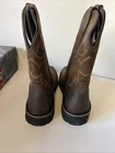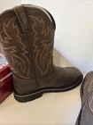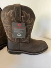 Please see pictures. New with tags but some minor side scuff. The Men's Wolverine Rancher ST Waterproof Steel-Toe Brown Boots are a durable and stylish option for casual or workwear occasions. With a square toe shape and pull-on closure, these boots feature an embroidered accent and are designed for comfort with a slip-resistant outsole. Made of leather with a waterproof and steel-toe construction, these boots are suitable for summer, fall, and spring seasons. The brown color and mid-calf shaft style add a western touch to the overall design, making them a reliable choice for the outdoor enthusiast.