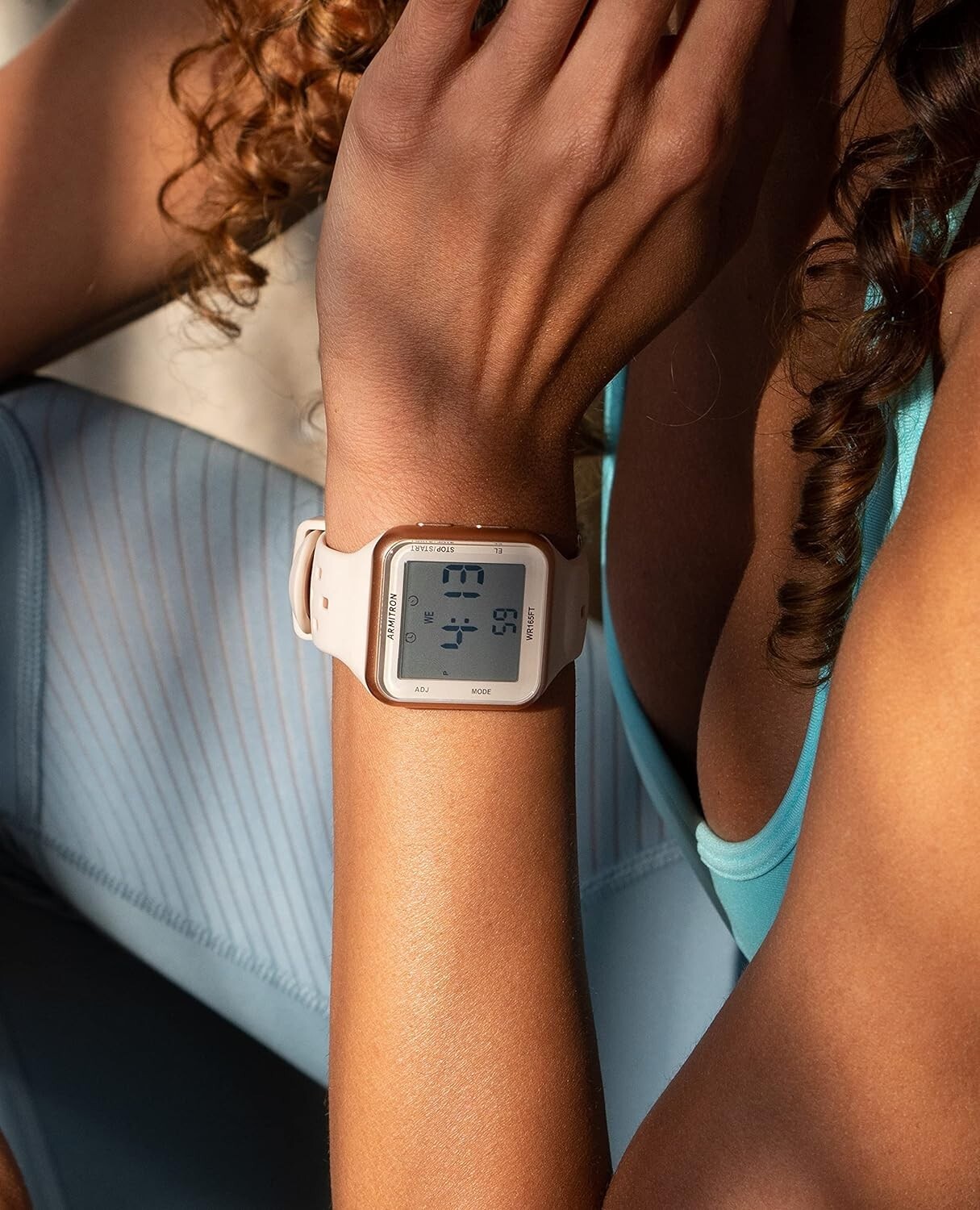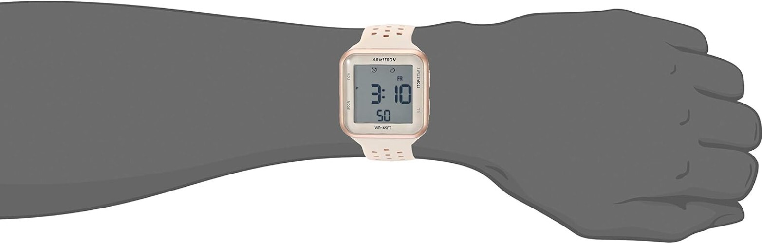 Sport Unisex Digital Chronograph Silicone Strap Watch, 40/8417 Rose gold-tone resin case; LCD display with time, seconds and day; pale pink/beige and rose gold-tone double injected silicone strap with buckle closure Functions include: date, chronograph, lap time, alarm, military time and backlight with three second delay Quartz Movement Case Diameter: 38mm Water resistant to 165 feet (50M) Quartz movement with digital multifuntional display.