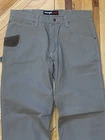 The product is a pair of Men's Wrangler Riggs Workwear Pants in a relaxed fit, size 34 waist and 32 inseam. They are in a gray color and are brand new with tags. These pants are part of the Wrangler RIGGS Workwear line, known for their durability and functionality. They are machine washable and feature a carpenter style with multiple pockets for utility purposes. Perfect for a comfortable and practical workwear option for men.