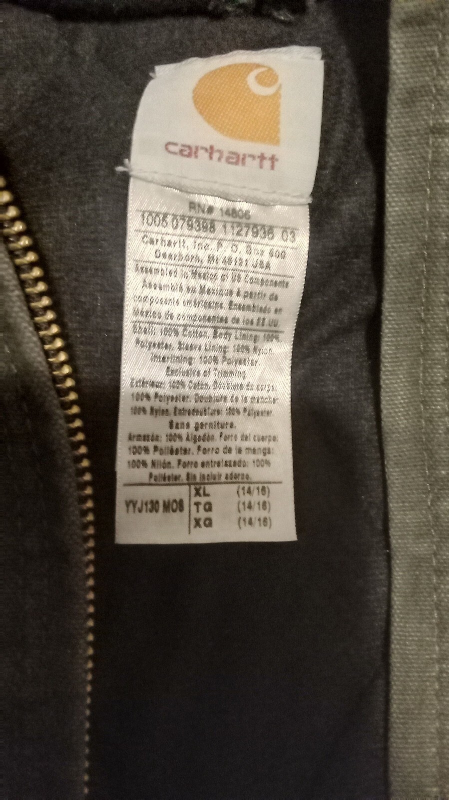 Men's XL Carhartt canvas insulated jacket in green, featuring a solid pattern. This bomber jacket is designed for outdoor activities and is made of cotton with polyester lining and insulation. The jacket has a regular fit and includes the Carhartt brand logo.