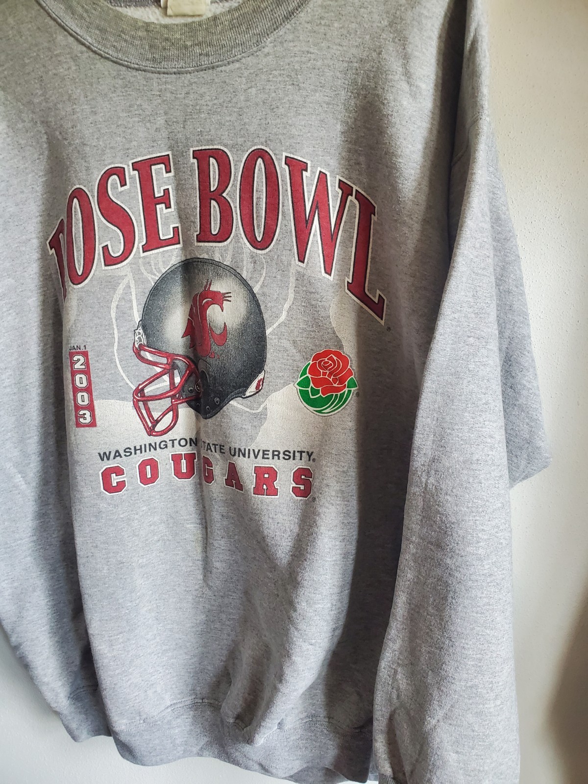 Show your support for the Washington State Cougars with this cozy fleece sweatshirt from the 2003 Rose Bowl. This unisex adult sweatshirt is size XL and features the iconic gray color. Perfect for any fan of college football, this sweatshirt is a must-have for any Washington State Cougars fan. This sweatshirt is made from high-quality fleece material, ensuring that you stay warm and comfortable during the colder months. Whether you're cheering on the Cougars at the game or just out and about, this sweatshirt is the perfect addition to any fan's wardrobe. Get yours today and show your love for the Washington State Cougars!