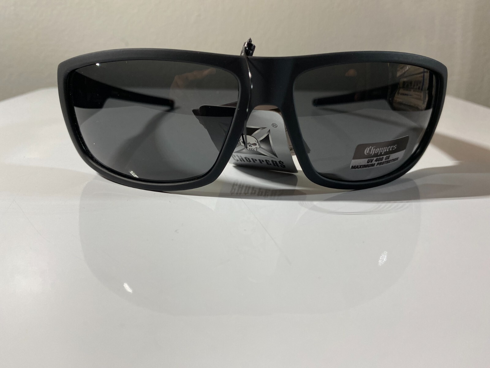 Men's popular riding sunglasses with black frame and smoke black lenses. Great price.