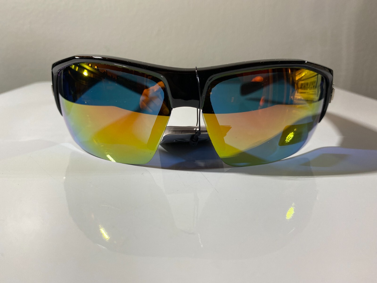 Men's popular riding sunglasses with black frame and yellow reflective lenses. Great price.
