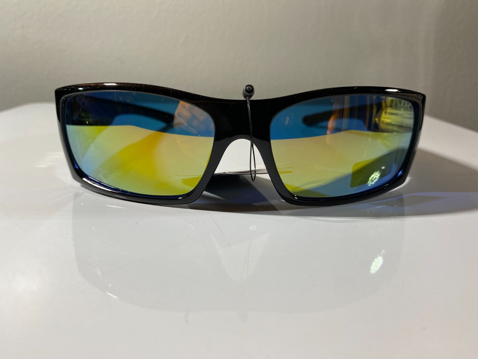 Men's wrap around sunglasses with black frame and yellow reflective lenses. Great price.