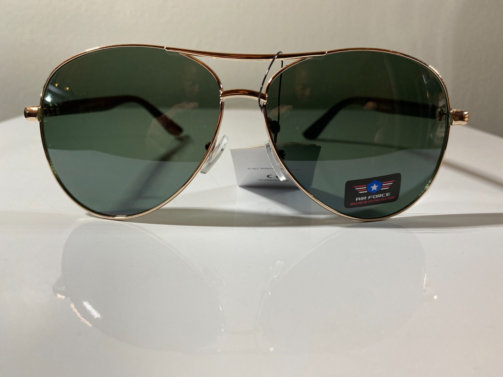 Men's aviator style sunglasses with gold wire frame and green lenses. Great price.