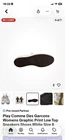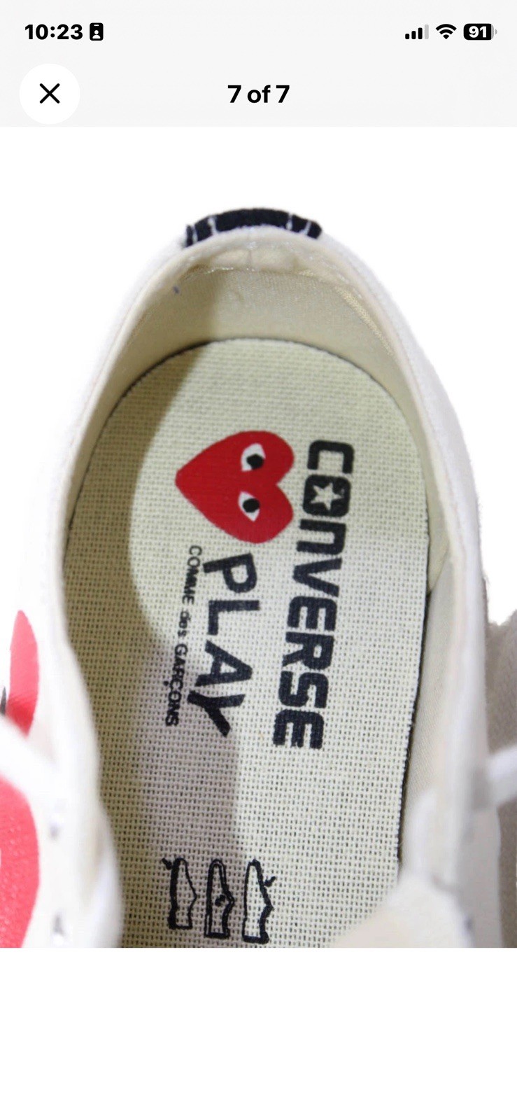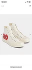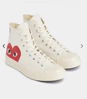 The product is a pair of Play Comme Des Garcons women's low top sneakers in white, featuring a geometric pattern and made of cotton material. These athletic shoes are designed in a stylish sneaker style, with a unique Comme Des Garcons model. The size 8 sneakers are perfect for women looking for a fashionable and comfortable footwear option.