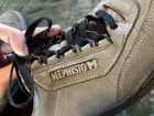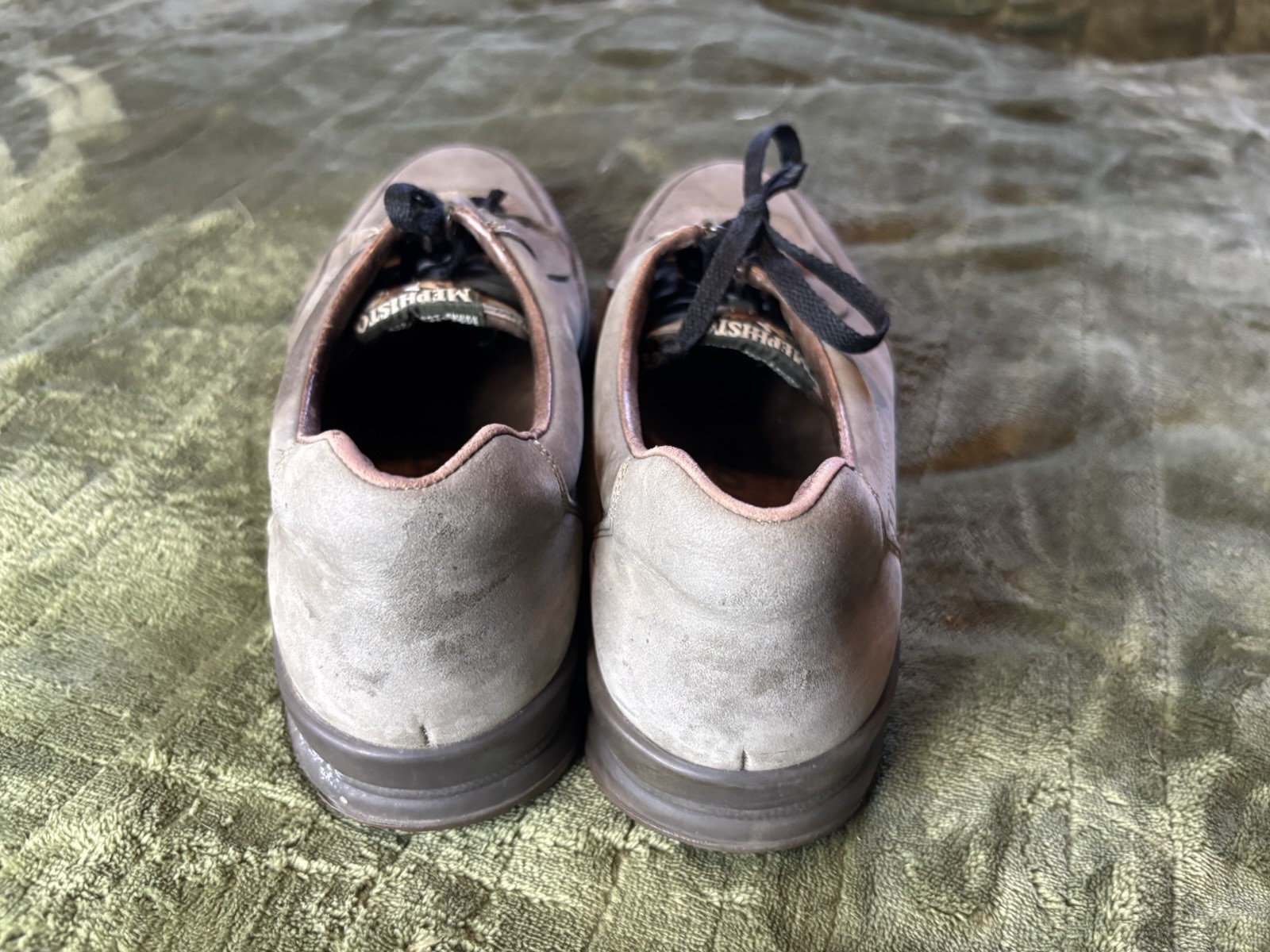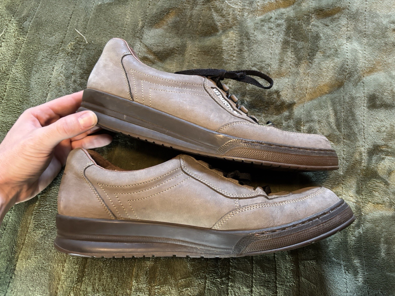 The Mephisto Rush Runoff Air Jet Shoes in brown nubuck suede are casual walking sneakers designed for men. Featuring a lace-up closure and a cushioned, comfortable outsole, these solid brown shoes are perfect for travel and everyday wear. The rubber outsole provides durability and traction, making them suitable for outdoor and city-themed occasions in the summer, fall, and spring seasons. With a focus on comfort and style, these Mephisto sneakers are a practical choice for men looking for versatile footwear options. There is some wear on the bottom of the shoes and some light scuffs and marks on the suede areas.