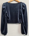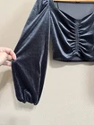 This is a Meraki women's crop top in blue grey crushed velvet with long balloon sleeves. Made of polyester and spandex, it features a sweetheart neckline, pullover closure, and front elastic. The top is lined, has a stretchy fit, and is non-iron. Its style is cropped, perfect for a variety of occasions like travel, weddings, parties, formal events, work, or business. Ideal for the winter, fall, and spring seasons.