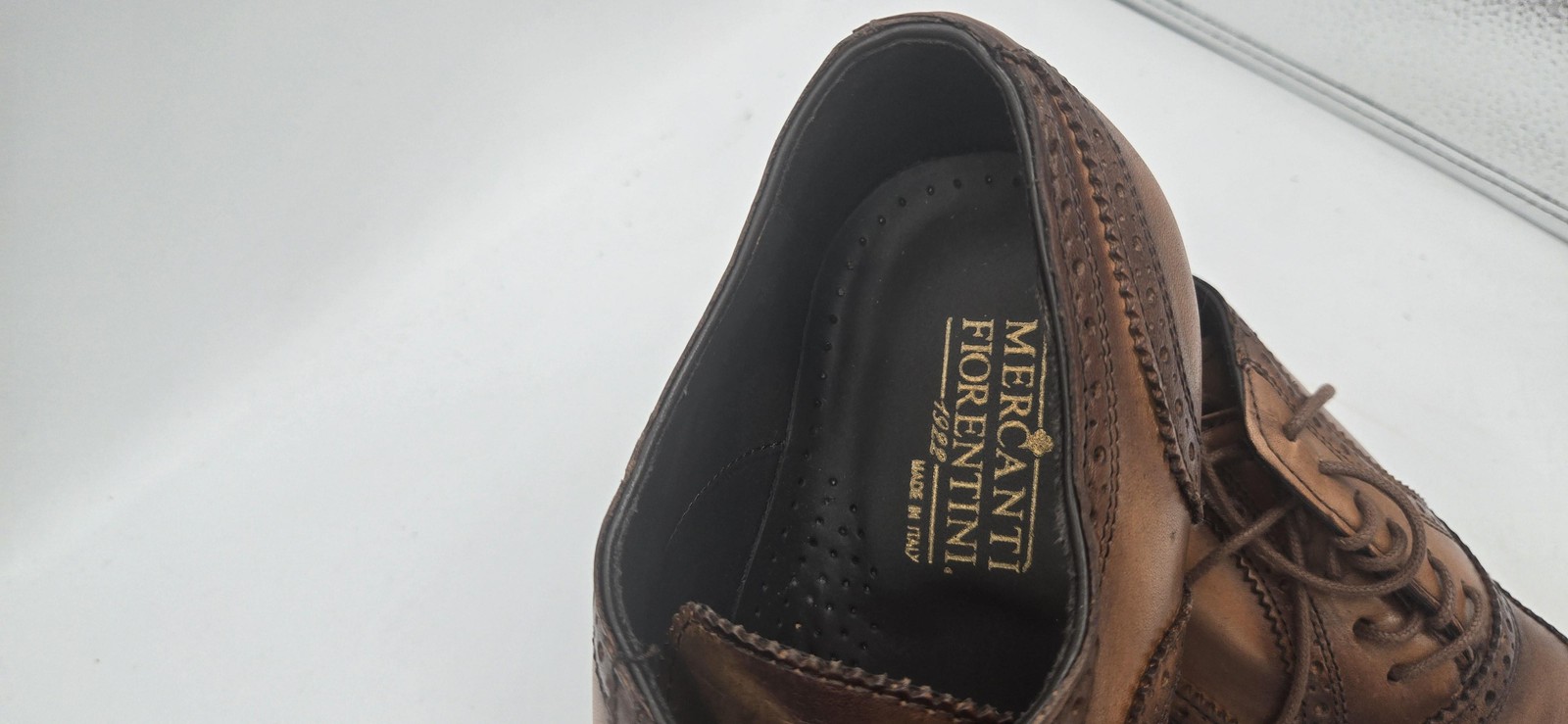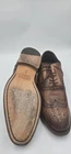 Brand: Mercanti Fiorentini Style: DeLaRentis mens brogue dress shoes with classic wingtip oxford design. Color: Burnished brown with darker shading at toe and heel. Size: US mens 9 M (medium width), as stamped on the sole. Materials: Leather upper, leather lining and insole, leather outsole with rubber heel cap. Details: Lace-up closure, wingtip toe, full brogue perforations and pinked edges, stacked heel, sleek almond toe profile. Country of origin: Made in Italy with Mercanti Fiorentini 1922 branding on insole and sole. UPC: 090654288350