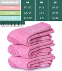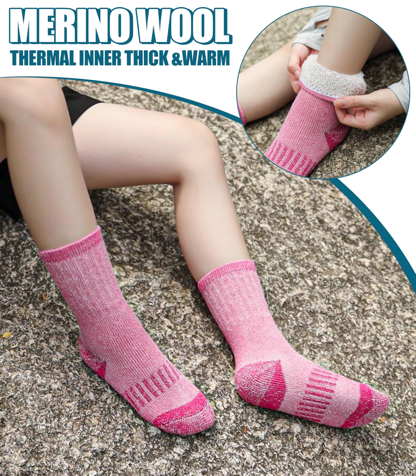 High Quality : The hiking socks is blend of premium merino wool.are made of 70% Merino Wool, 23% Polyester, 5% Spandex, 2% Nylon.These socks are soft comfortable, lightweight, wearable and sweat-wicking. Size : There are 3 sizes to choose, 4-7 years, 8-12 years,12-15 years . They are suitable for hiking , running ,skiing , gym class ,playing outdoor or other activities. PACKAGE INCLUDED : This package includes 3 pairs of merino wool ski socks designed specifically for boys girls.These boot socks have high stretchy cuff and arch support, keeping socks stable, improving blood circulation and reduce plantar fasciitis. HIGH PERFORMANCE : Socks have thick loops on the toes, soles and heel to provide cushioning.The reinforced heel can prevent blister and the thicken toe does not grind kid’s feet, the thermal inner can keep feet warmer and more comfortable.They are great hiking socks for boys girls. PERFECT GIFTS FOR : The winter wool socks are perfect gifts for boys, girls, teenagers, they can be birthday gifts, children's gifts, Christmas gifts, etc.