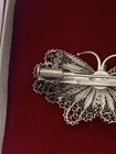 This Vintage Merlo Sebastiano 800 Silver Filigree Butterfly Brooch Pin is a beautiful and elegant piece of jewellery, perfect for adding a touch of sophistication to any outfit. The intricate silver filigree design and butterfly shape make it a unique and eye-catching accessory. With its original design, hallmarked metal, and seller warranty, you can be sure of the quality and authenticity of this vintage piece. The Marlo Sebastiano brand adds a touch of luxury to this timeless brooch, making it a must-have for any woman looking to elevate her style.