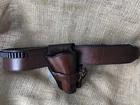 This is a Mernickle Holsters genuine leather belt and holster rig designed in a Western style for carrying a revolver on the hip. It is specifically made for shooting activities and features a belt attachment for secure carrying. The product is pre-owned, reflecting its previous ownership or use. The holster loops are sized to carry 22 caliber ammunition. The belt size is 44 inches. The holster and ammunition is designed for a revolver long gun.