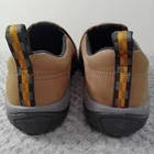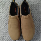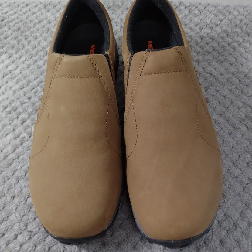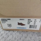 Brand: Merrell Style: Jungle Moc Nubuck slip-on casual/outdoor shoes with low-profile design. Color: Brown nubuck leather upper with black trim and grey/black outsole. Gender: Mens Size: USA 10 M; UK 9.5; EUR 44; CM 28 (per box label). Style/Model code: J60831. UPC: 738575120792. Details: Slip-on construction with dual elastic goring, heel pull tabs, cushioned dual-density midsole, and grippy rubber outsoles with Merrell branding.