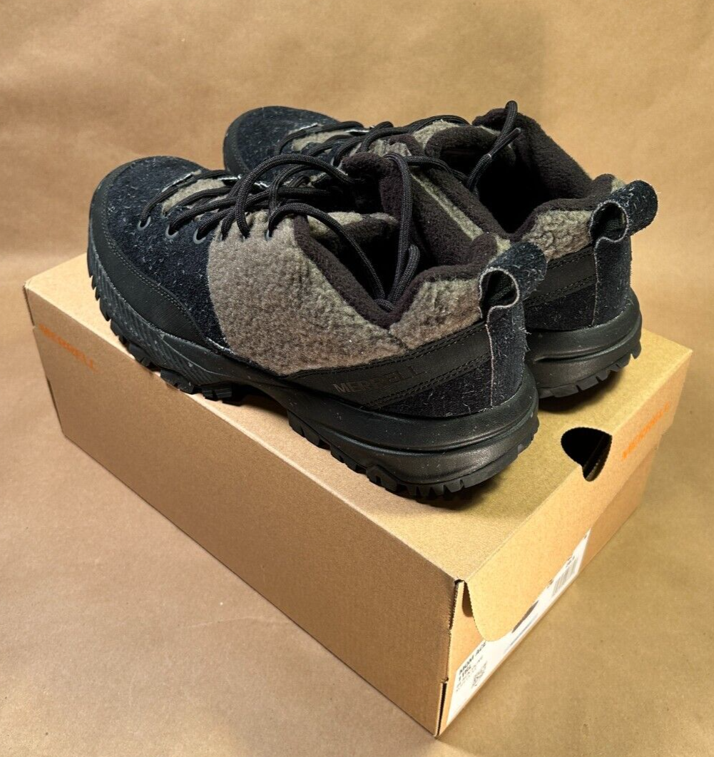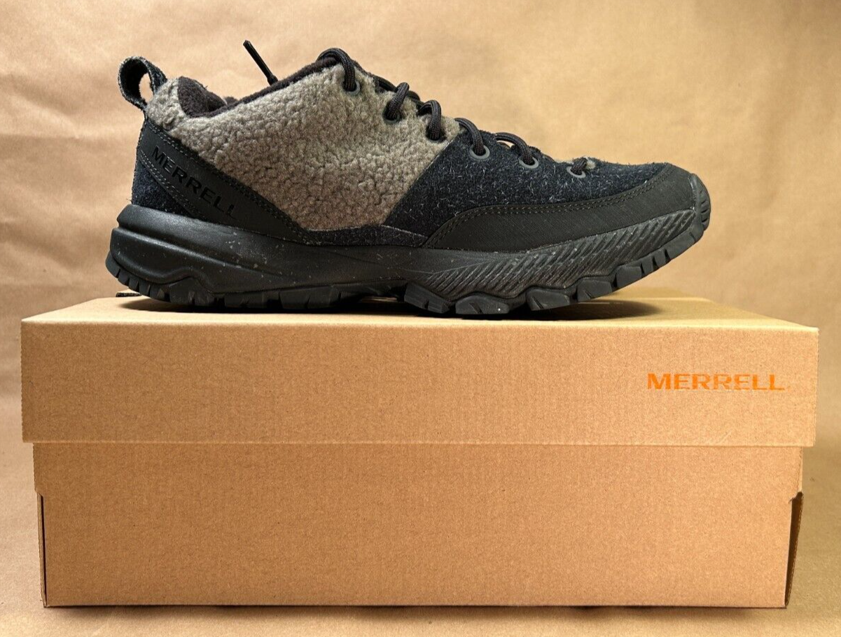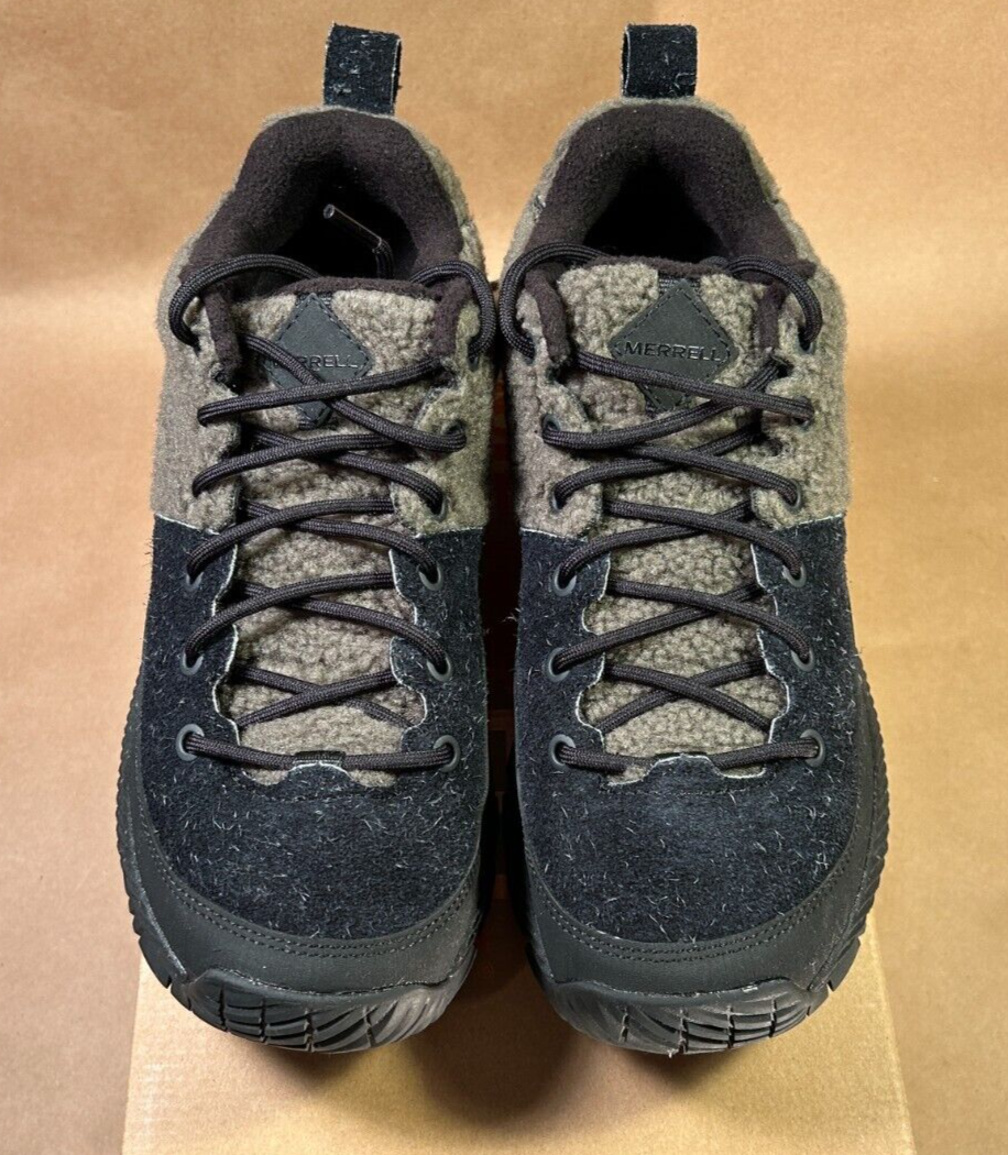 Brand new in box. MSRP $160.00. This stylish yet ruggedly comfortable shoe features trademark Merrell detail and craftsmanship... • Pig suede leather and wool upper • 100% recycled laces • Bellows tongue keeps out debris • Protective and abrasion resistant rubber toe cap • Fleece lining • 100% recycled mesh footbed cover • Cleansport NXT™ treated for natural odor control • 50% recycled removable EVA foam footbed • Molded nylon arch shank • Merrell Air Cushion in the heel absorbs shock and adds stability • Rock plate for protection • Super Rebound Compound midsole with 10% recycled flecks provides durable shock absorption to help reduce torque and allow for a smooth transition into the midfoot • Vibram® Ecostep Recycle outsole designed with 30% recycled rubber which provides added durability and improved grip on wet and dry surfaces Black and Olive. J067897. Men's size 8.5 US (8 UK, 42 EUR). Buyer pays calculated shipping. Thanks for bidding!
