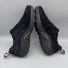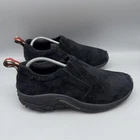 Merrell Jungle Moc Shoes Mens Size 7.5 Black Suede Slip On Comfort Casual Pre-owned with light wear. Suede uppers clean with minor creasing. Soles show light dirt and tread wear but plenty of life. Brand: Merrell Style: Jungle Moc slip-on casual comfort walking shoes with low profile and round toe. Color: Black with matching midsole and multicolor plaid heel pull tab. Gender: Mens Size: USA 7.5, UK 7, EUR 41, 26 cm (per inside tag). Upper material: Suede leather; outsole: rubber lug sole for traction. Style/Model code: J60825. Made in Vietnam. Details: Cushioned insole, elastic side gores for easy on/off, Merrell branding on side and insole. 660 Measurements: - Previous washings may change the sizing written on the tag. - Please refer to the photos above for all measurements. - Please compare our measurements to that of one of your favorite garments. - Please note, item measurements are approximate . All items are bagged and sealed after being photographed, then stored in a smoke free environment to ensure the item is exactly the same as when photographed. All items have been cleaned per eBay standards & policies. I carefully package and ship daily. Feel free to contact me with any questions.