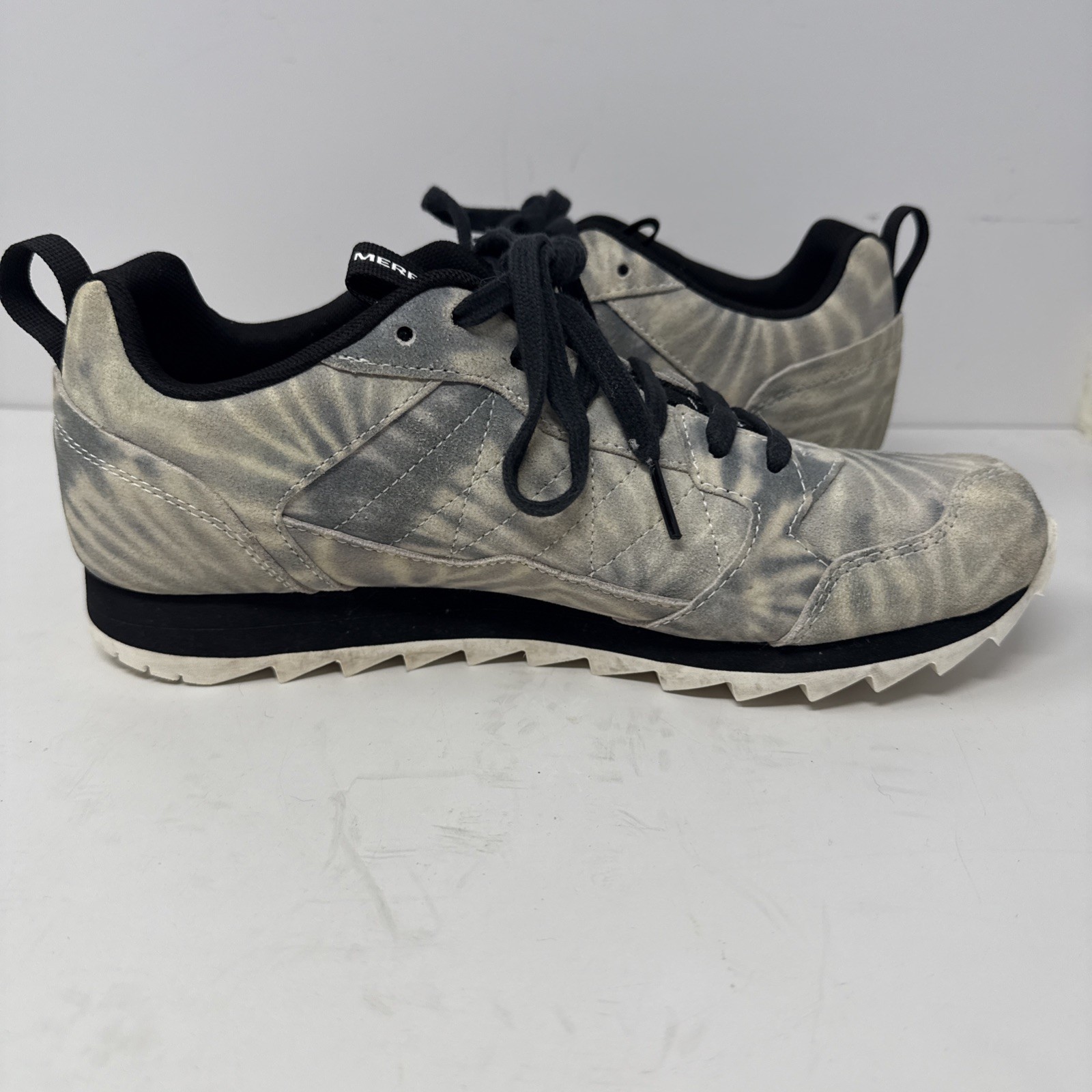 The Merrell Women's Alpine Tie Dye Running Shoes in white and gray are designed for casual wear with a lace-up closure and low-top style. Made with leather upper material, these athletic shoes feature the brand's logo as accents, offering comfort and breathability. Perfect for running and jogging, these shoes are suitable for all seasons and have a sporty theme ideal for active women seeking both style and performance in their footwear. Made in Vietnam, these shoes are in size 9 and are a great addition to any woman's athletic shoe collection. Please refer to photos for condition.
