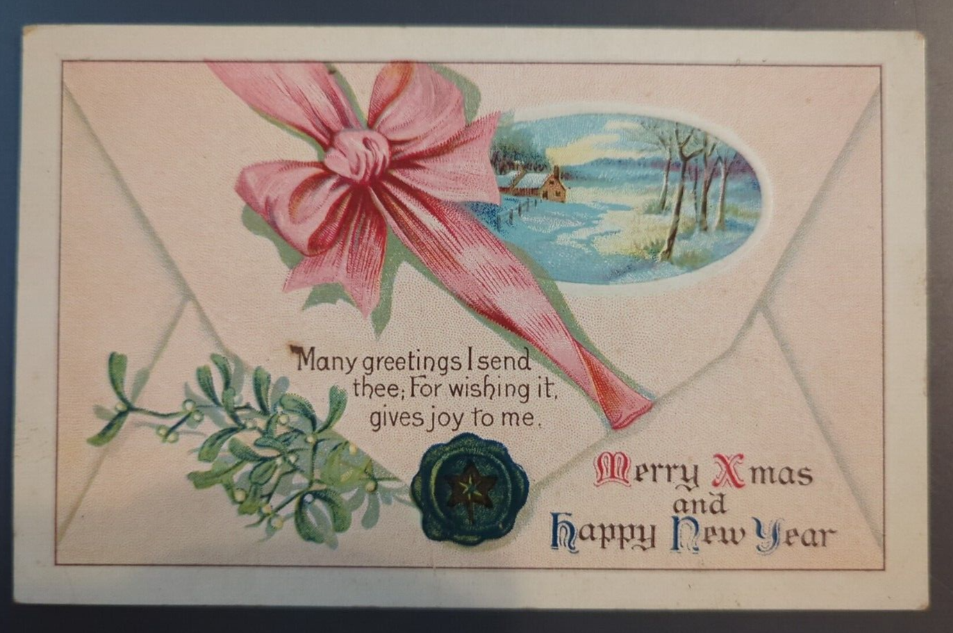 Antique Postcard Merry Xmas & Happy New Year Greetings Faux Wax Sealed Envelope. There may be wear on the edges or a bent or torn corner, staining or writing on the card, creasing, or the card may have a cancellation mark. Most of the postcards I sell are 50 to 100+ years old and will never be perfect. Please examine the photos carefully for condition information. All postcards with a value of less than $20 are shipped via eBay Standard Envelope with a 2 mm postcard sleeve and a piece of cardstock on either side, taped closed with masking tape and placed in a heavy cardboard mailer. Postcards with a value of more than $20 are sent Ground Advantage in a 2 mm postcard sleeve, sandwiched between cardboard and shipped in a padded polybag. Both methods are provided with tracking.