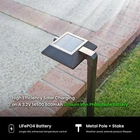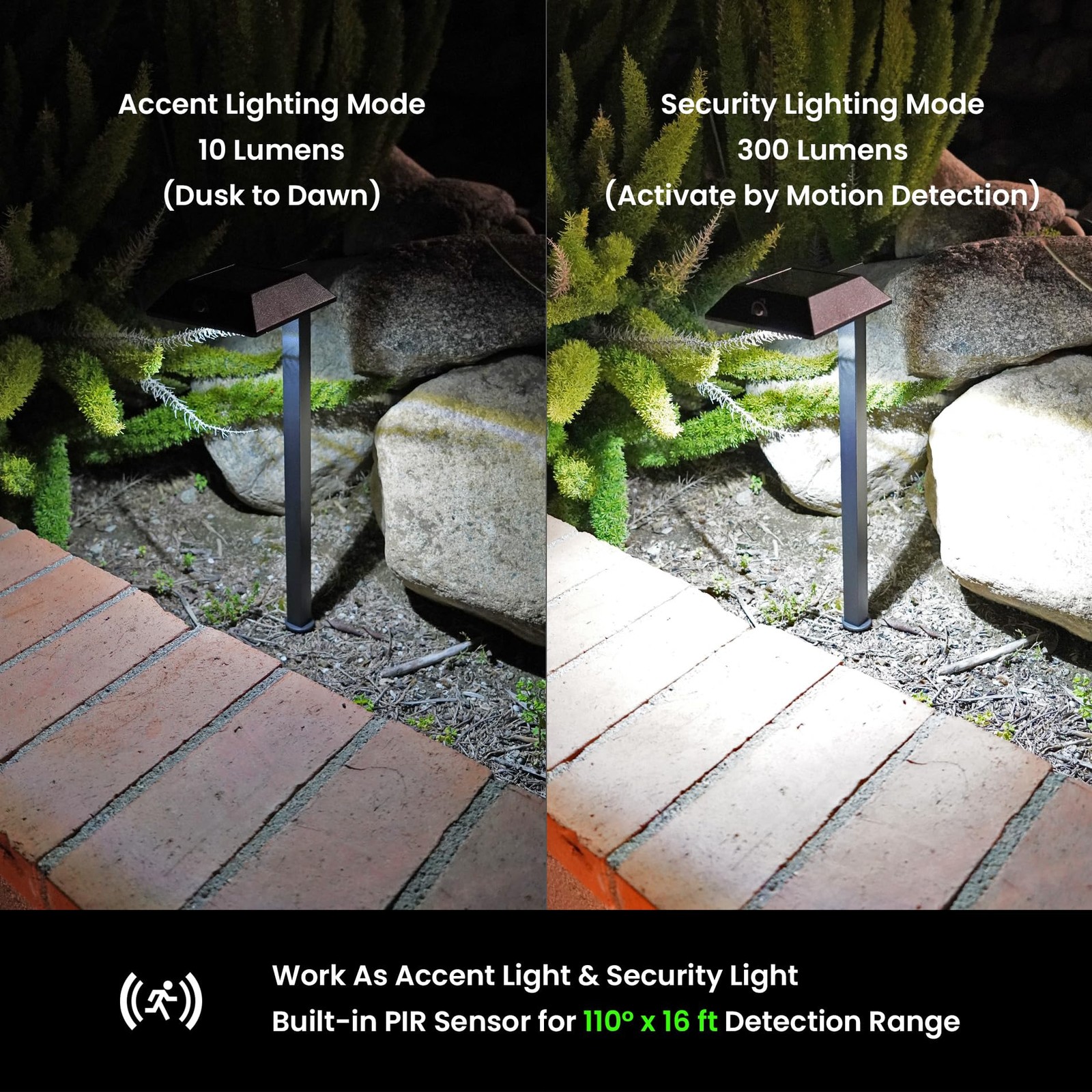 Hybrid Design : This light functions as both an accent light and a security light. It emits 10 lumens in standby mode and 300 lumens when motion is detected within a 110-degree by 16-foot range. Patented Linkable Feature : All path lights that are assigned to the same channel will be connected via radio frequency autmotically, and activate at the same time and a motion is detected. No WiFi or app needed. 4-Channel Management : The system offers 4 channels, allowing users to assign groups of lights to different zones or areas, such as the front yard, backyard, RV parking, or any other outdoor space. Adjustable Color Temperature : Users can choose their preferred color temperature - 3000K (warm white), 4000K (bright white), or 5000K (daylight). Designed for Longer Lifespan : This light features a rechargeable lithium iron phosphate battery, known for its excellent temperature control and is charged by a highly efficient solar panel. The light fixture is made of weather-proof plastic with a stainless steel body and stake.