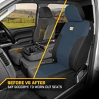 DURABLE PROTECTION – From the work site to your home base, Cat Car Seat Covers offers dependable protection against wear and tear for your automobile. The modern styling also helps to refresh the look of your interior by covering up old, worn-out seats. BREATHEABLE MESH – Specially-selected materials help to provide maximum comfort during your daily commute. The honeycomb mesh back and seat of our covers provide enhanced ventilation so that you stay cool and comfortable during your drive. FORM FITTING DESIGN – Cat Automotive Seat Covers are designed to fit most vehicles with removable headrests. Our form-fitting design conforms to the contours of your seats using anchor bars that are built into the covers themselves, providing a snug fit in nearly in vehicle. AIRBAG COMPATIBLE – We use a unique side stitching technique along the outside edge of each seat cover. This stitching is designed to release whenever the side airbag deploys to allow for interference-free operation of built-in safety features. EASY TO INSTALL – With a universal fit design and easy-to-follow installation image, our Cat Front Seat Covers can be setup in your vehicle within minutes. Please see our product images for fitment examples. Some additional work may be required to create a ‘perfect’ fit. Cat® MeshFlex Automotive Seat Covers for Cars Trucks and SUVs (Set of 2) – Black and Blue Car Seat Covers for Front Seats, Truck Seat Protectors with Comfortable Mesh Back, Auto Interior Covers