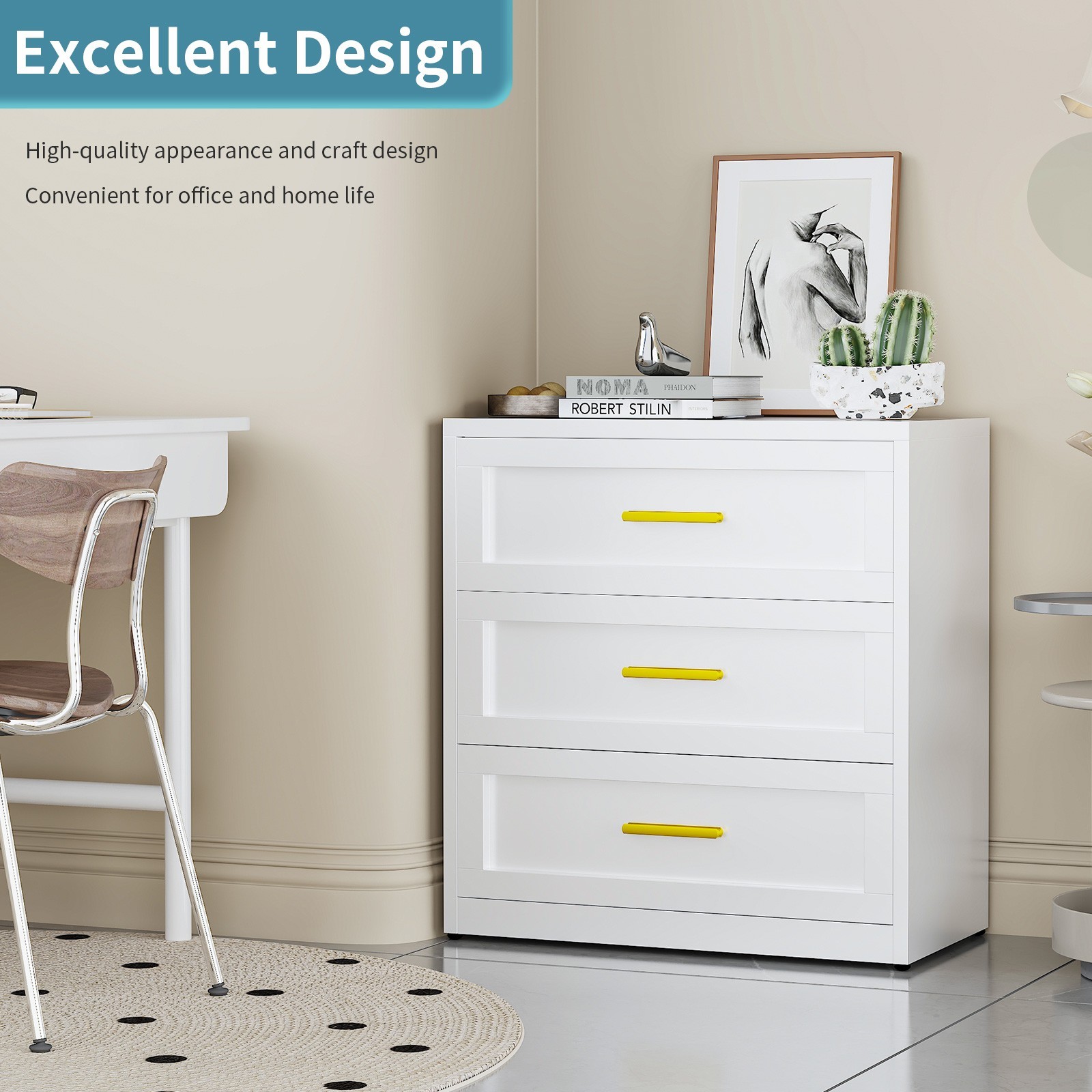 Adequate Storage Space: 3 spacious vanity dresser for bedroom provide enough space to meet the bedroom storage needs or finishing cosmetics, and dresser can also be used as a dresser for bedroom,drawer organizer, drawer divider to store daily necessities and keep a clean living space. Robust Metal Dresser: This white dresser for bedroom is made of high quality metal, strong structure, durable materials, compared to wood cabinet, this dresser for bedroom is more waterproof, wear resistant, moisture resistant, and no smell, so the tall dresser is used more widely, and lasts longer life. Adequate Storage Space: 3 spacious vanity dresser for bedroom provide enough space to meet the bedroom storage needs or finishing cosmetics, and dresser can also be used as a dresser for bedroom,drawer organizer, drawer divider to store daily necessities and keep a clean living space. Large Capacity Tall Storage Cabinet with Doors: This small dresser with drawers has 3 large and deep drawers, can meet a variety of storage needs, fashionable appearance can be compatible with a variety of use scenarios, whether as drawer dresser, or as large dresser for bedroom, provide storage at the same time, and beautify the living space. Large Capacity Tall Storage Cabinet with Doors: This small dresser with drawers has 3 large and deep drawers, can meet a variety of storage needs, fashionable appearance can be compatible with a variety of use scenarios, whether as drawer dresser, or as large dresser for bedroom, provide storage at the same time, and beautify the living space.
