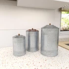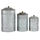 Set of three 11", 9" and 7" farmhouse rustic galvanized iron round canisters, hammered finish with subtle fence-ribbed sides and oxidized black ball-capped lids. Vintage style metal canisters with lids feature a galvanized finish. Use chalk-like markers to note the contents of the jars. Suitable to use as a decorative item. Best for both indoor and outdoor use. Rustic texture and old age look Both decorative and functional It is food safe