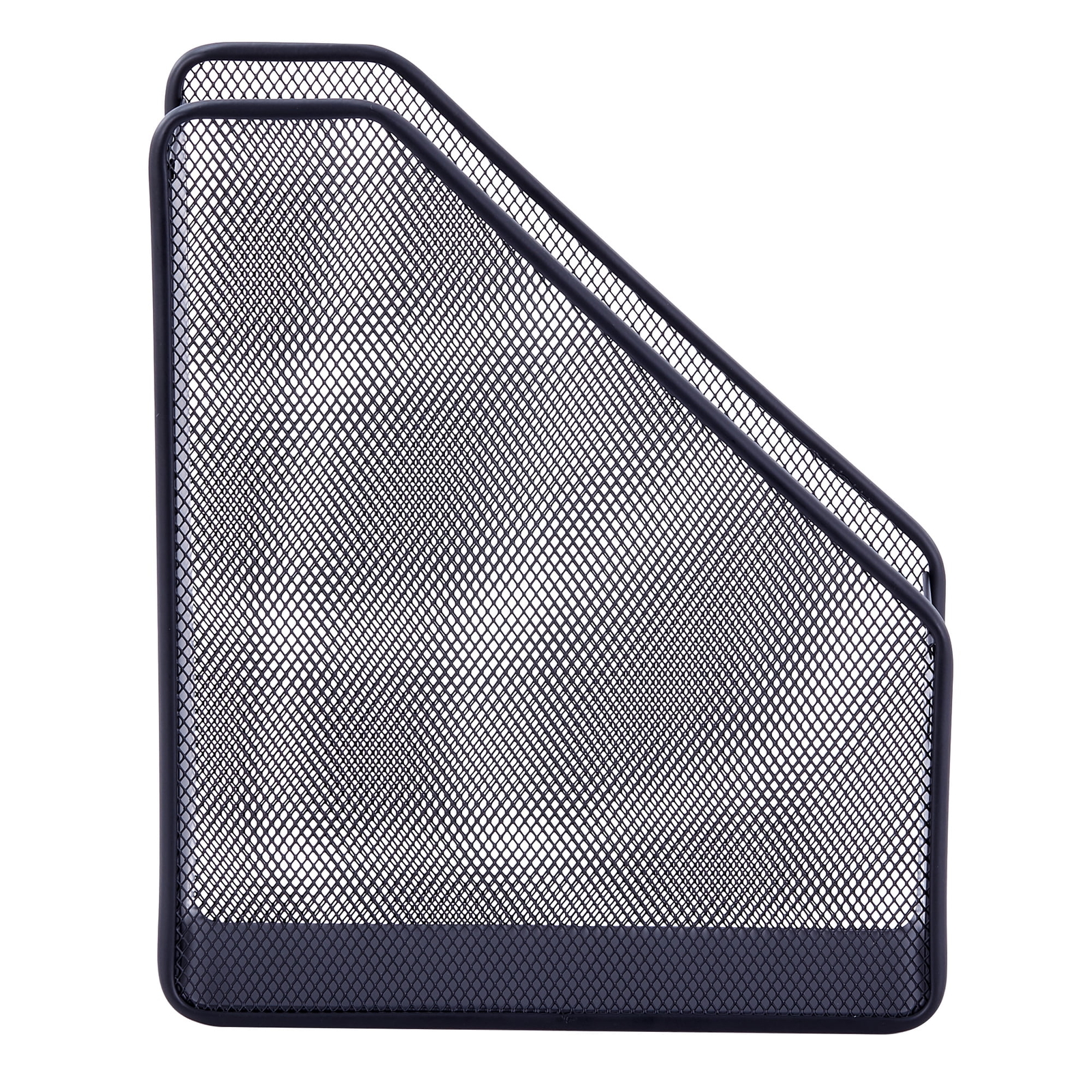The space-saving Pen+Gear Metal Mesh Magazine File Holder, Black, One Big Compartment has room to store magazines, notebooks, journals, documents, and more. The sturdy, standing magazine holder leaves a small footprint, but makes a big difference on your shelf, desk, or countertop. Cut-out walls and a tall back panel allow you to quickly view and identify book and magazine covers, while securely holding your items in place. The open front means you can quickly insert and remove your files. For added convenience, an open top accommodates taller books, magazines, and journals. Lightweight and durable, the sleek, metal mesh design of this black file holder looks stylish anywhere. Pen+Gear Metal Mesh Magazine File Holder, Black, One Big Compartment. Metal mesh design desktop organizer keep your magazines and files in order Open top of the organizer accommodates tall journals and books Mesh designs provides easy viewing and access Label holder lets you easily insert card to identify contents Perfect for home or office Size: 9.98" x 3.07" x 12.28" Black finishing Check out the entire Pen+Gear collection for more office essentials