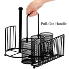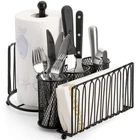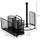 Metal Caddy OrganizerOur folding mesh caddy with a plate holder, a towel holder and 3 utensil holders allows you to display and serve flatware, paper towels, and dishes in style.The paper towel holder can be folded into the caddy, and the handle can be removed for easy storage.The buffet server saves a great deal of space and would also make a wonderful housewarming gift.Featuring a pull-out handle, it is easy to move to a picnic, buffet, or dining table.With our caddy organizer, you'll always have utensils, cookware, napkins, and paper towels neatly arranged, which is ideal for both indoor and outdoor entertaining. metal flatware caddy organizer comes with 1 paper towel holder, 1 plate holder, 3 utensil holders. Total size (assembled): 12.4"L x 9.5"W x 10.6"H. The paper towel holder can be folded up, and the spindle is removable for easy storage. Sturdy Steel: Our silverware caddy organizer's robust construction is created from high-strength carbon structural steel and coated with a food-safe, non-BPA powder coating to ensure its enduring brightness even in harsh conditions. Practical Organizer: With mesh holes on the bottom and ventilation area on the side, the cutlery caddy allows for quick utensil drying. Pull-out handle in the middle makes it easy to carry the organizer around. Elegant Style: The kitchen utensil holder has an antique look thanks to its nicely greased black finish. This is an attractive piece to have in kitchen, dining room, for parties, wedding receptions, family gatherings, and everyday use. Multi-Use: The 3 cylinder sections in the center are ideal for storing utensils such as spatulas, flatware, ladles, whisks, spoons, forks, and knives. 2 sections on the sides are suitable for neatly organizing your napkins, paper towels, and drying plates.