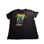 The graphic is askew... error in pressing.(see pic) This Metallica t-shirt is a must-have for any fan of the band. Featuring the iconic Grim Reaper logo in bold yellow on black, this shirt is perfect for anyone who wants to show off their love for Metallica. Made of lightweight cotton knit fabric, it is comfortable enough to wear in any season. The shirt is designed with a regular fit and short sleeves, making it perfect for casual wear. The crew neckline adds to the classic look of the shirt. This t-shirt is a great addition to any wardrobe and is sure to turn heads. Get yours today!