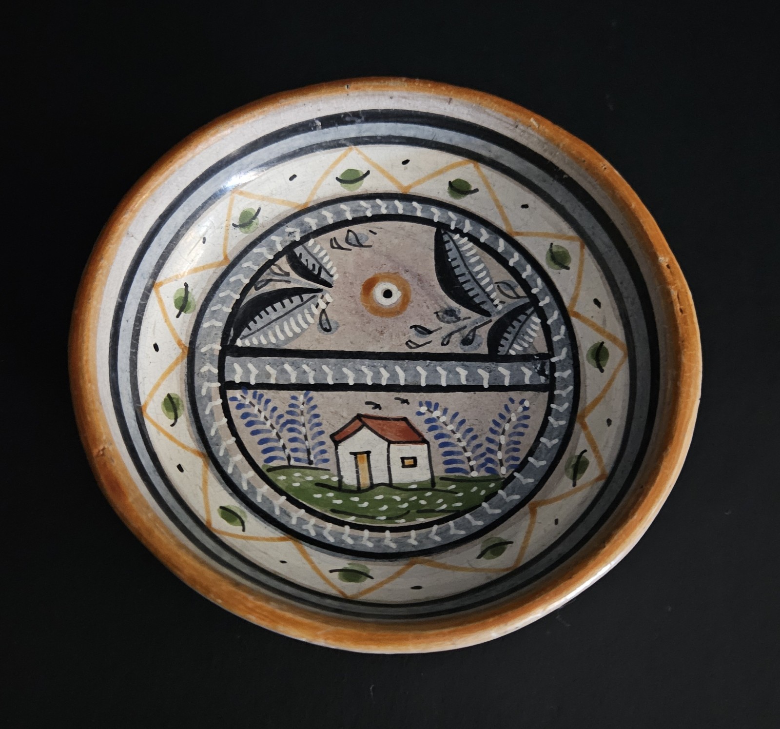 Vintage hand painted footed pottery folk art trinket dish. Made in Tonala Mexico. 4"W x 1 3/8"H. No chips, cracks or damage. Signed.