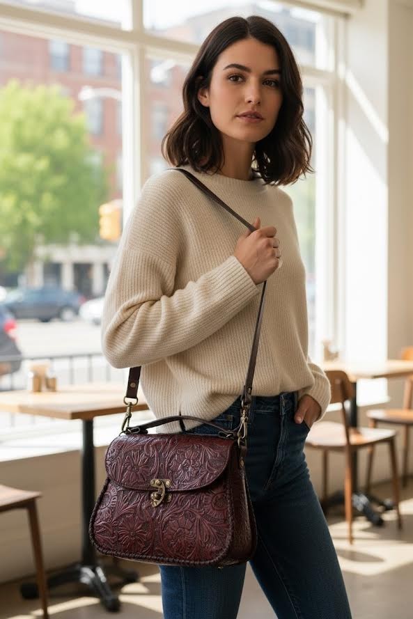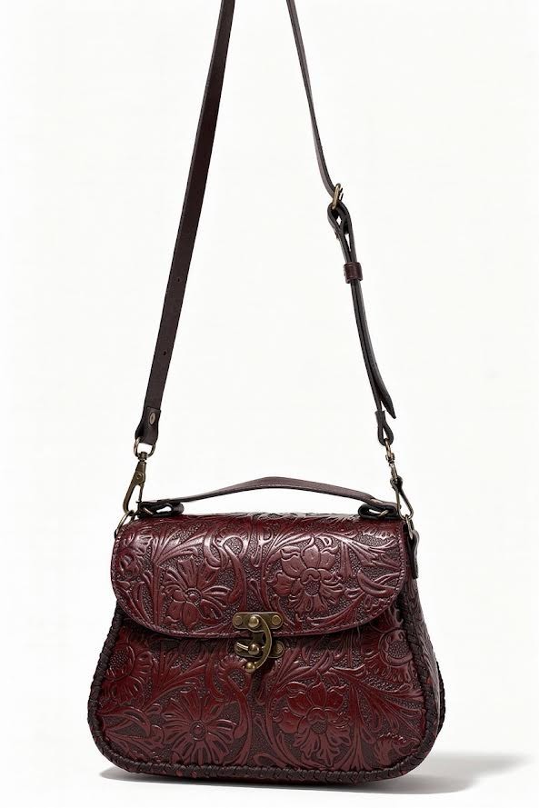 This beautiful bag is crafted from genuine vaqueta leather , a firm and durable leather known for its strength and ability to keep its shape over time. Handmade in León, Guanajuato, Mexico , a city world-renowned for its leather craftsmanship. The bag features a hand-tooled embossed floral design , giving it an artisanal, vintage-style look. Each piece may have slight variations, making every bag unique. Designed for versatility, it can be worn as a shoulder bag or crossbody thanks to its adjustable leather strap . Finished with antique brass-tone metal hardware and a secure zip closure , this bag is both stylish and practical for everyday use. Details Material: Genuine vaqueta leather RED with black strap Finish: Natural matte Style: Shoulder & crossbody bag Shape: Structured rectangular Size: Medium Closure: Zipper Accents: Embossed / tooled leather Hardware: Metal, antique brass tone Strap: Adjustable Handle/Strap drop: Approx. 22–24 in Measurements: 9.5” W x 7” H x 4” D Condition: New Made in: Mexico