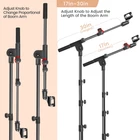 Dual Support Tripod Music Stand: The microphone stand features an innovative dual support tripod construction that increases the stability of the music stand and holds the microphone securely in place; The non-slip feet prevent it from moving around Floor Mic Stand: The music stand is dual purpose, providing both a boom arm and a straight mic stand; the movable arm extends freely from 17"-30", and the 360° angle can be rotated with an adjustable knob for easy positioning Adjustable Microphone Stand: Microphone stand height adjustable from 25”to 62”, this microphone stand ensures optimal positioning for any artist; It provides the flexibility required to find the perfect angle and height for your microphone, bringing utmost convenience to your performances or recordings Mic Stand Bag: Comes with a premium music stand bag; no need to disassemble, just adjust the stand to its lowest level and place it in the bag, making it convenient for gigging musicians or podcasters on the move Compatible With Most Microphones: The two different styles of mic clips in the package are compatible with most types of microphones, such as ATR2100x-USB, Blue Yeti, Snowball, Hyper X QuadCast, SoloCast, Shure SM7B, AT2020, Fifine AM8, Shure SM58, Shure SM48, Shure PGA48, Samson Q2U, etc.
