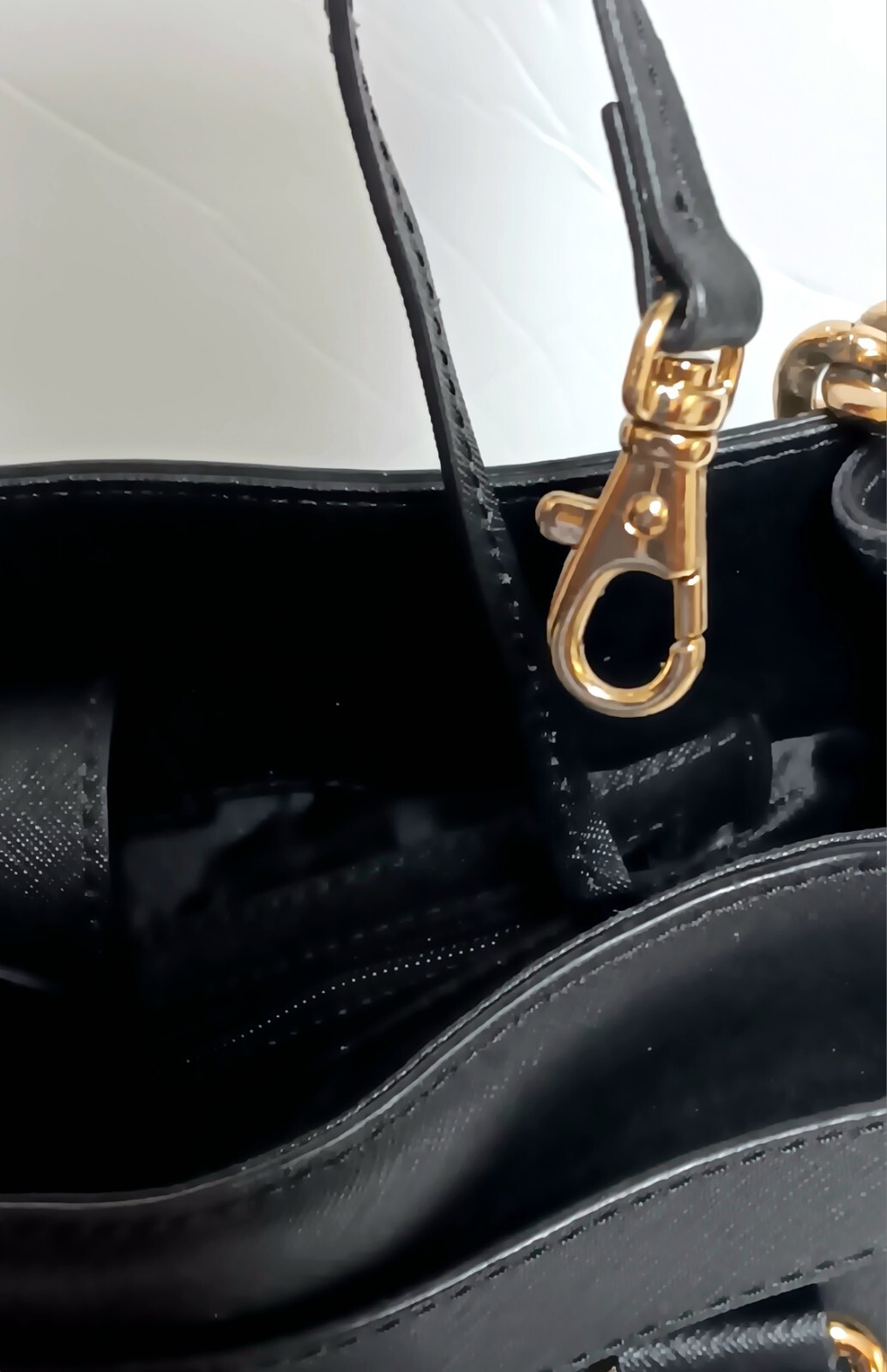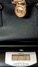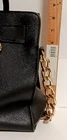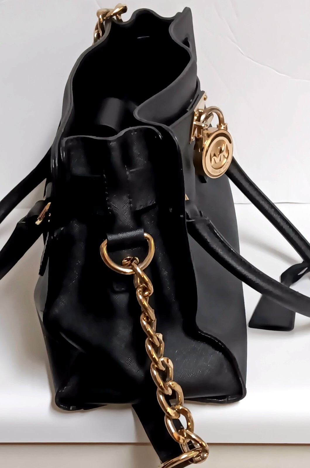 Michael Kors Purse Black Hamilton Satchel Tote Shoulder Bag Gold Chain & Lock With Key. Gently pre-loved good clean condition. I purchased this purse and a caramel brown one approximately in 2017 or 2018 from Dillard's. The purse measures approximately 12"L X 9"H X 5"W. Unsure of the outer material, which feels like a man-made synthetic leather. The key for the padlock is inside the black hang tag on the carry handle. The chunky gold chain shoulder strap is not removable on this particular design. There is also a keychain attachment strap inside of the purse. It weighs approximately 2.8 lbs empty. See photos.