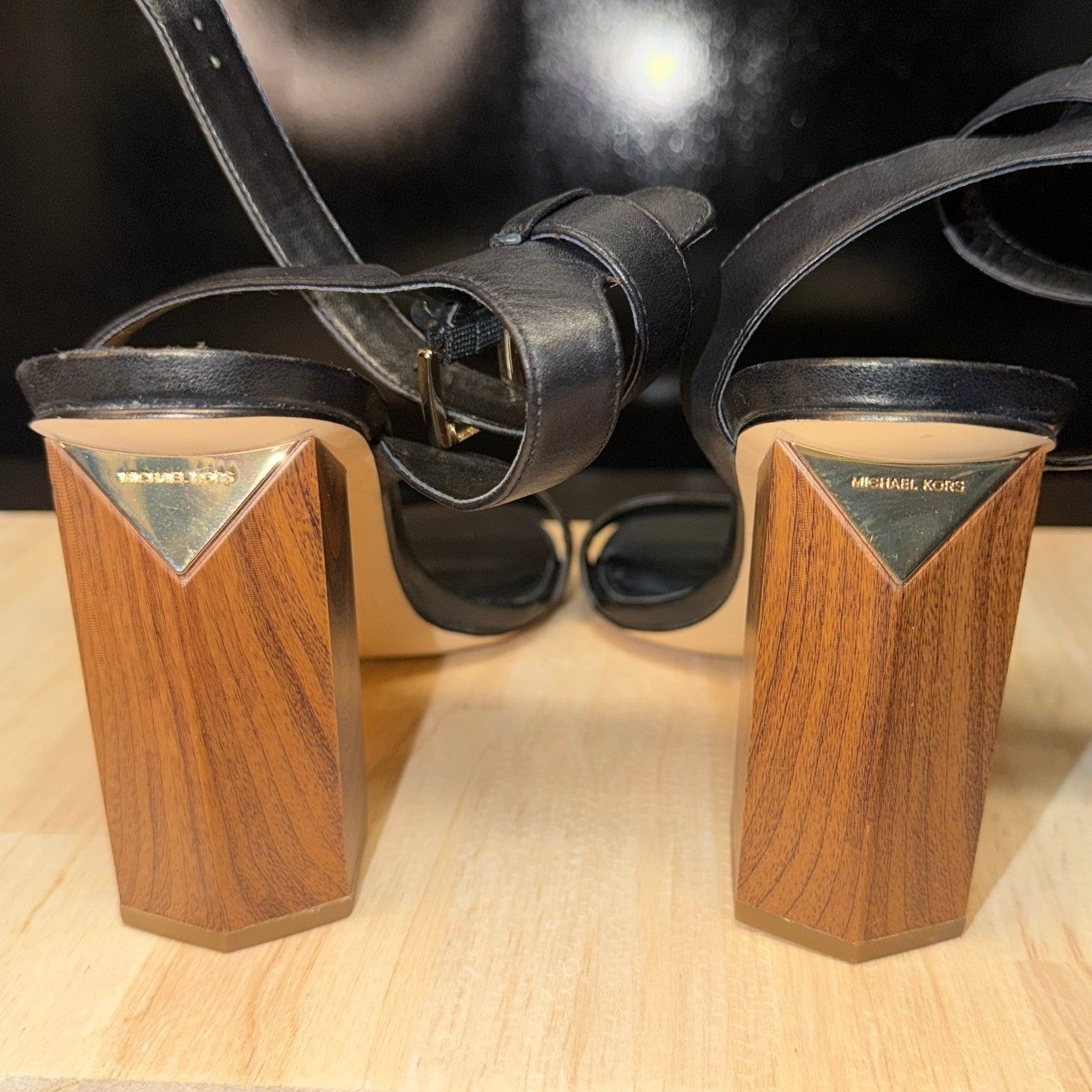 Michael Kors black leather block heel sandals with a distinctive wooden heel. These open-toe sandals feature a delicate ankle strap with buckle closure for adjustable fit and a stylish block heel crafted from rich wood. The sole of each sandal displays the Michael Kors logo and sizing information. Style: Strappy Department: Women Upper Material: Leather, Faux Leather UK Shoe Size: 6.5 AU Shoe Size: 8.5 Heel Style: Block Type: Heel Toe Shape: Open Toe Pattern: Solid Closure: Buckle Features: Ankle Strap, Adjustable Strap Insole Material: Leather Outsole Material: Rubber Lining Material: Leather Shoe Width: M Keywords: Michael Kors sandals, leather sandals, wooden heel, ankle strap, block heels, designer shoes, women's fashion, open toe, dressy sandals, smart casual, summer footwear Item is preowned, effort has been made to ensure all flaws are displayed photos serve as additional description Sizing varies by manufacturer and time period, please see measurements.