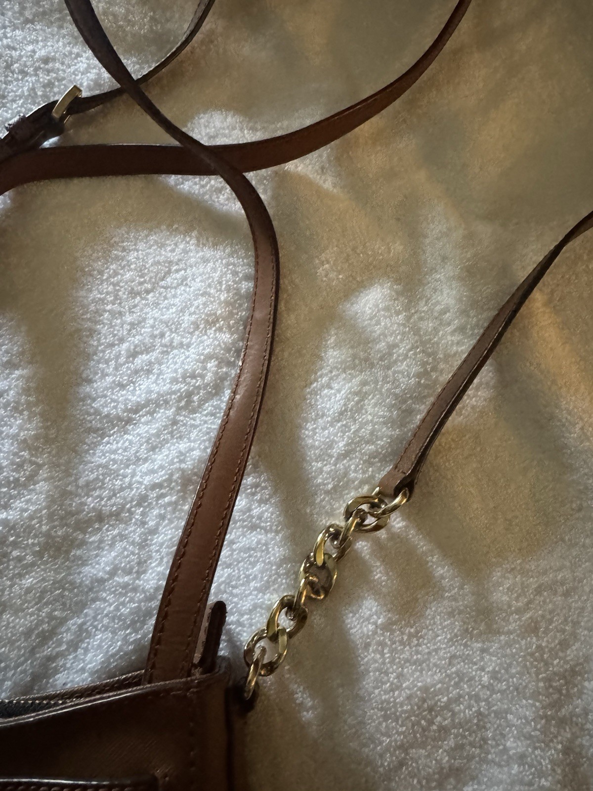 The Michael Kors Brown Leather Crossbody Bag is a stylish and practical accessory for women. Made from pebbled brown leather with gold-plated hardware, this small rectangular bag features a zip closure and a detachable crossbody strap. The bag has a solid pattern with a beige fabric lining, making it suitable for everyday use or special occasions. The Michael Kors signature logo adds a touch of designer flair to this versatile and fashionable piece.