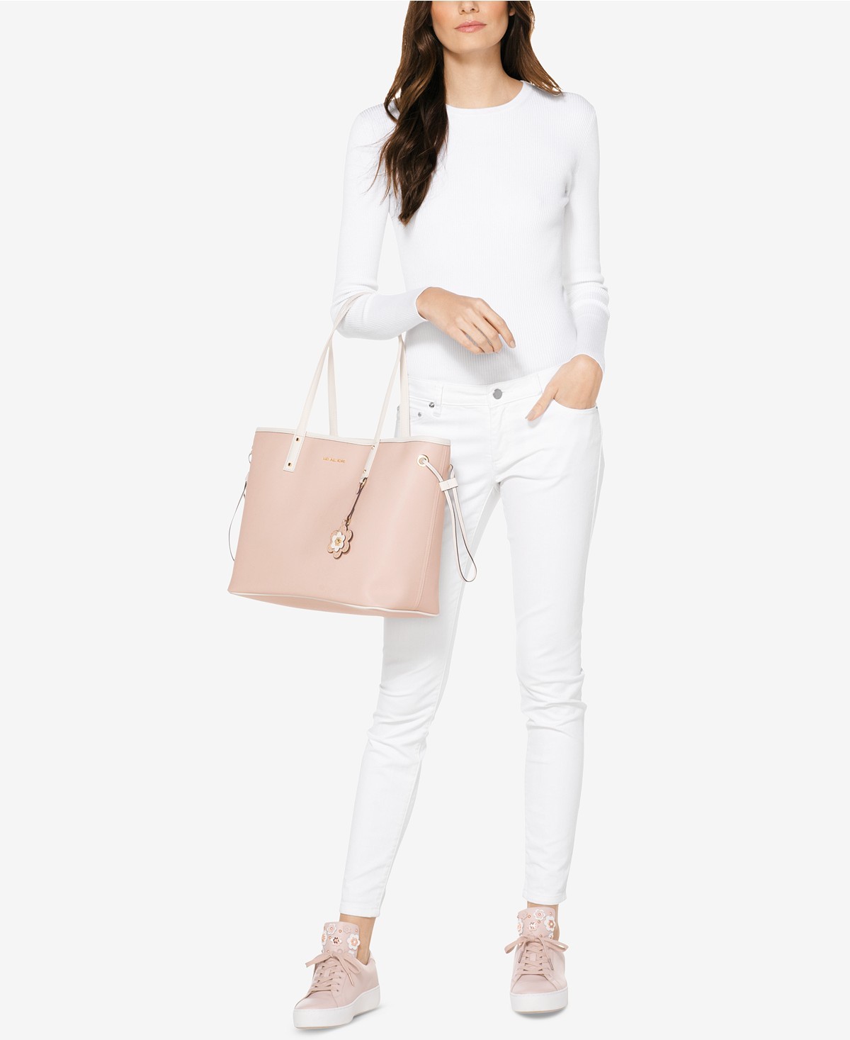 **Item Ships Brand New in Sealed Package With Tags** BRAND : Michael Kors BAG TITLE: Carter COLOR : Exterior Soft Pink STYLE : Large Size Tote Bag with Flower Key Fob INTERIOR Cream Color Coated Canvas CONDITION : Brand New With Tags MEASUREMENTS : 11.5"H x 18"W x 6"D and 10" Duo Strap Drop CARE : Spot Clean HARDWARE: Gold Tone Michael Kors Designer Stamped Hardware MATERIAL: Coated Canvas