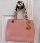 This Michael Kors Cynthia Saffiano Leather Satchel Bag in pink features a rectangular shape with a magnetic closure and gold hardware. It has a top handle and a detachable pink leather crossbody strap with a drop of 18-21 inches. The bag has button and strap accents, bottom studs, inner pockets, dividers, and a key clip. It is a medium-sized bag suitable for travel, weddings, casual, or business occasions.