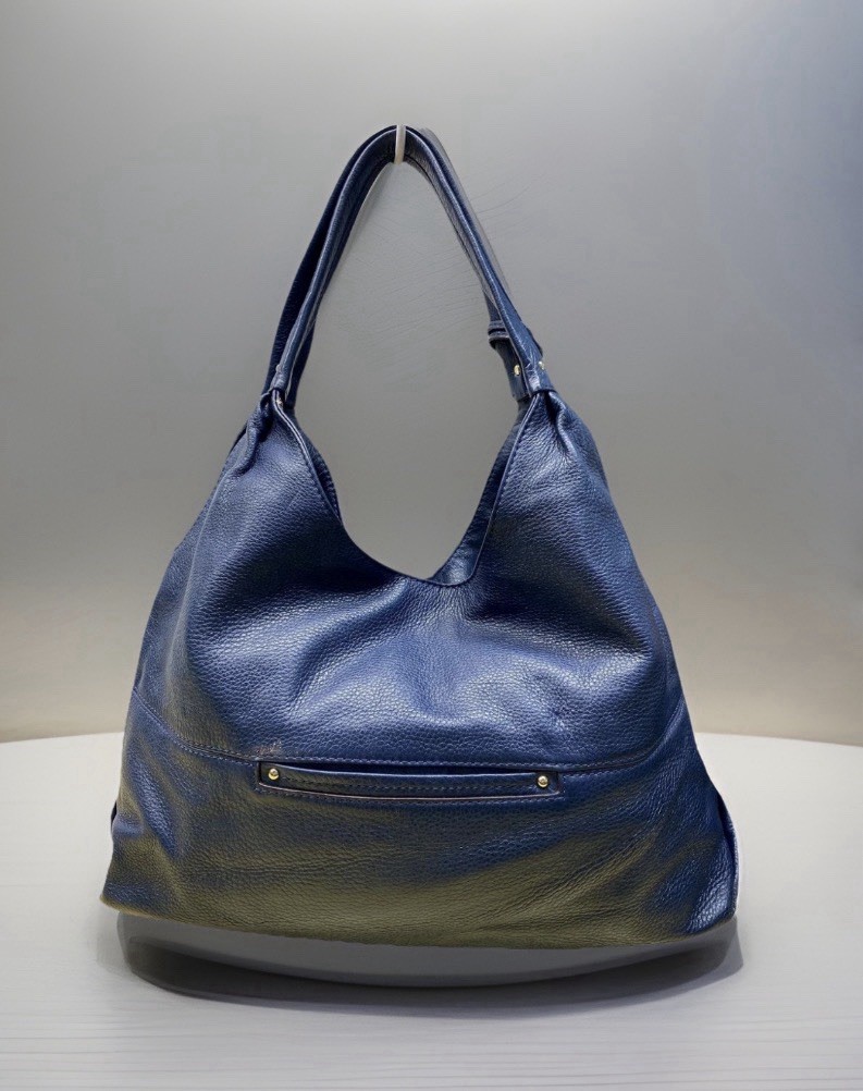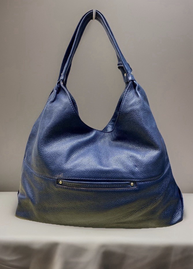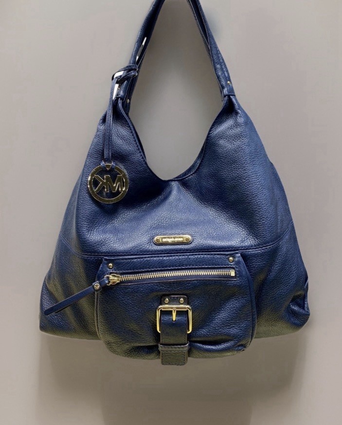 Beautiful authentic Michael Kors hobo-style shoulder bag in a stunning navy blue pebbled leather. This spacious bag features gold-tone hardware throughout and showcases Michael Kors' signature quality craftsmanship. Key Features • Brand: Michael Kors • Style: Hobo shoulder bag • Color: Navy blue with olive green gradient at bottom • Material: Genuine pebbled leather • Hardware: Gold-tone • Interior: Light fabric lining with "Michael Kors" repeated pattern • Closure: Magnetic snap closure with buckle detail Design Details • Front exterior zip pocket for easy access • Functional buckle accent on front • Michael Kors signature circular logo charm attached to handle • Gold-tone metal nameplate on front • Adjustable shoulder strap with buckle • Interior includes multiple pockets for organization • Interior leather tag stamped "Michael Kors"