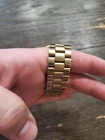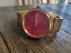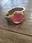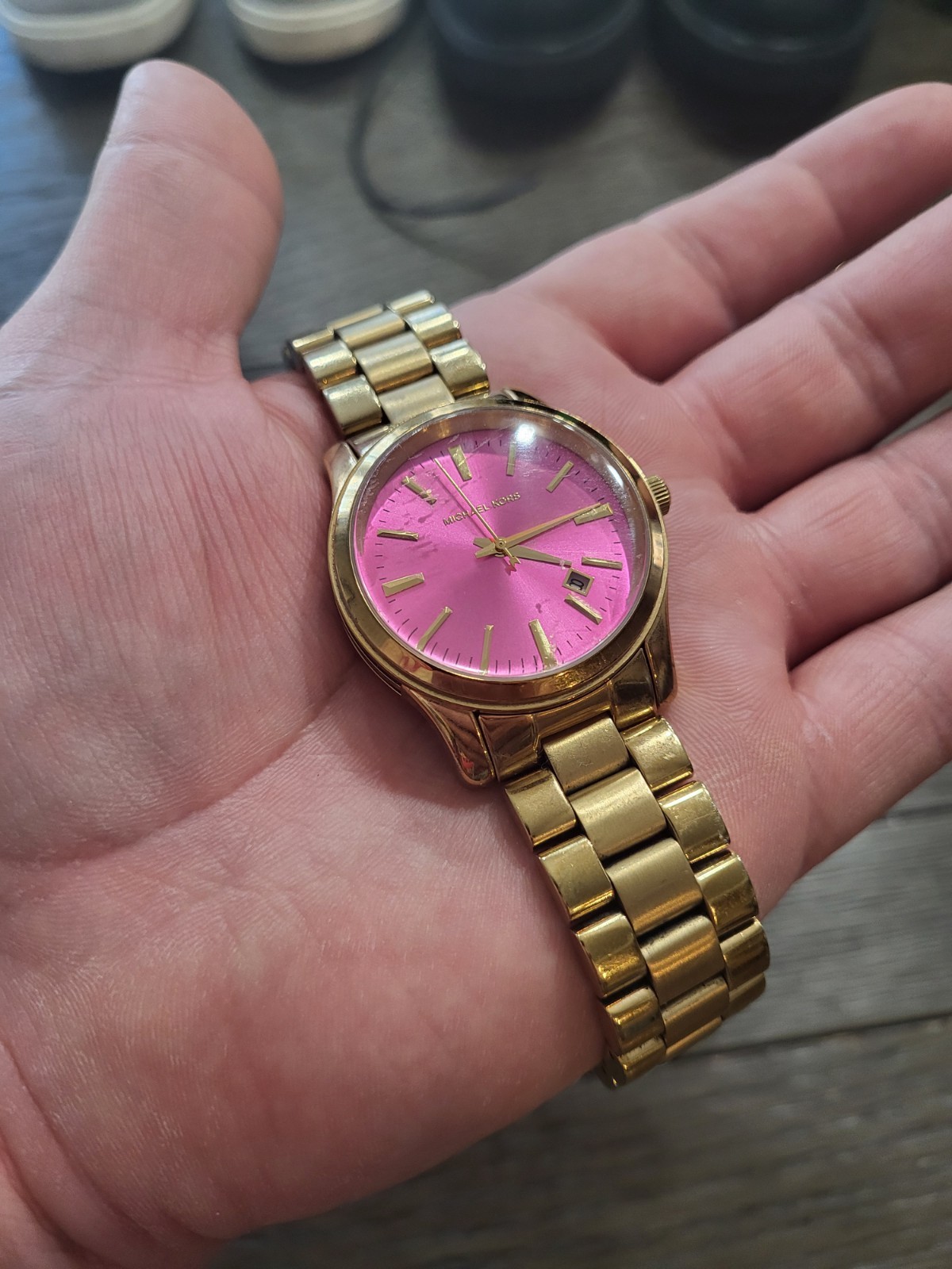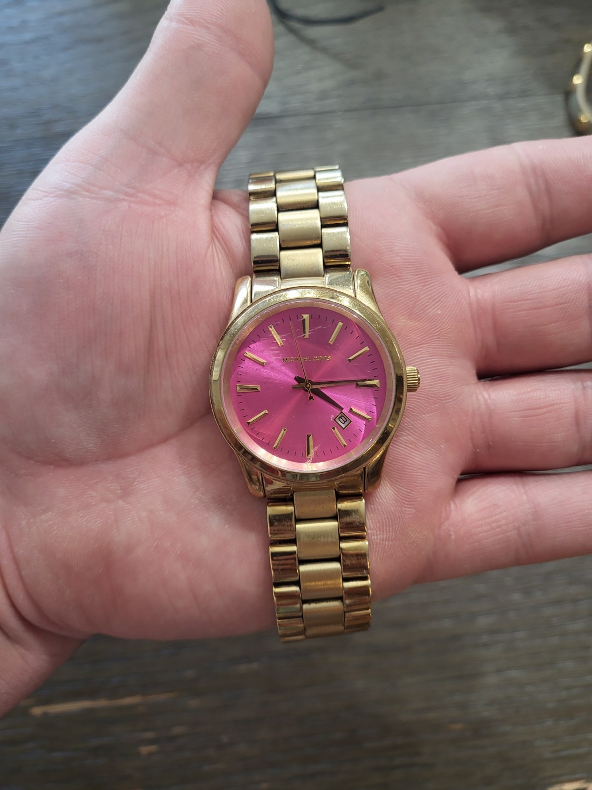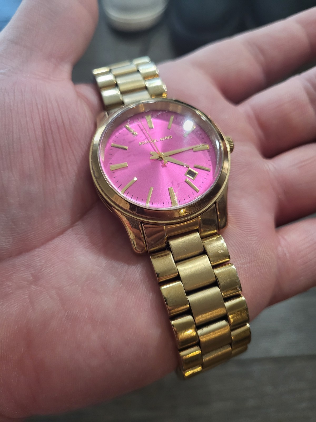 The Michael Kors Golden Runway Watch for women is a stylish timepiece featuring a 38mm pink dial with baton indexes. The glass has a blemish towards the bottom and a light scuff towards top left as pictured. The rest of the watch looks good. The watch has a quartz movement and is water-resistant up to 100 meters. It comes with a stainless steel bracelet in a matching gold tone, making it a perfect accessory for formal occasions. The watch also includes features such as a date indicator, seconds hand, and a 12-hour dial, adding practicality to its elegant design. The sleek round case and gold accents make this Michael Kors watch a chic and timeless choice for any woman's wardrobe.
