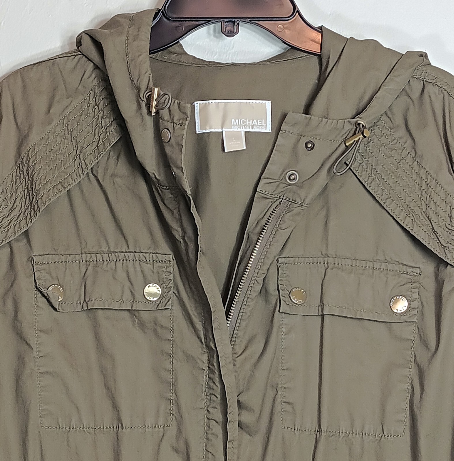 Color: Olive green Gold tone hardware with Michael Kors branding Size: L Brand: MICHAEL Michael Kors Fabric: 100% Cotton Chest: 47 inch Length: 28.25 inch Full zip + 3 snap button closure Adjustable drawstrings at the hood and waist area 4 large cargo pockets Long sleeves C ondition: Very good Stylish lightweight Michael Kors hooded cargo jacket perfect to wear year round. Very good condition, possible light wear.
