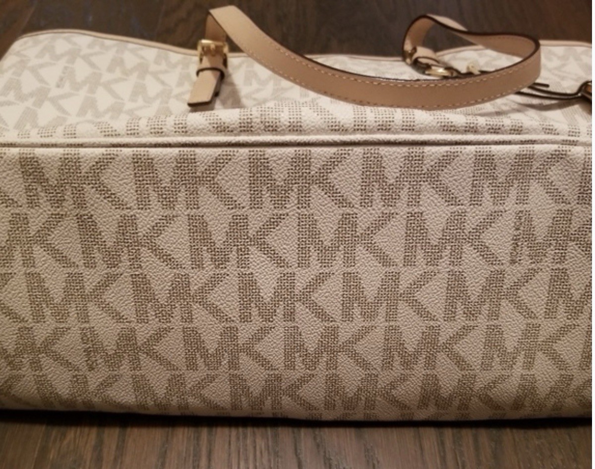 The Michael Kors Jet Set Travel Top Zip Signature Monogram Tote Vanilla Beige Bag is a stylish and spacious tote designed for travel. Made with leather and Saffiano exterior in an off-white color, this large rectangular bag features a zip closure, gold hardware accents, and double beige leather handles. The bag also includes inner pockets, adjustable straps, and a buckle accent for added flair. With its classic designer theme and monogram pattern, this bag embodies luxury and sophistication, making it a perfect accessory for any fashion-forward woman on the go.