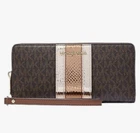 New With Tag Michael Kors Jet Set Travel Continental Wristlet Wallet MK Signature Center Stripe Exotic Accents PVC Leather Brown Multi 100% Authentic Retail: $328.00 Plus Tax Gold Toned Hardware Zip Around Closure Custom Fabric Lining 16 Card Slots, ID Window 3 Multi-Function Compartment 8.25"(L) X 4"(H) X 1"(D) 8" Removable Strap Very Clean, Smoke-Free and Pet-Free Environment. Michael Kors Items are from An Authorized Michael Kors Store and I am not affiliated with Michael Kors. International buyers are responsible for your country taxes, duties and vats. Thank you for shopping!