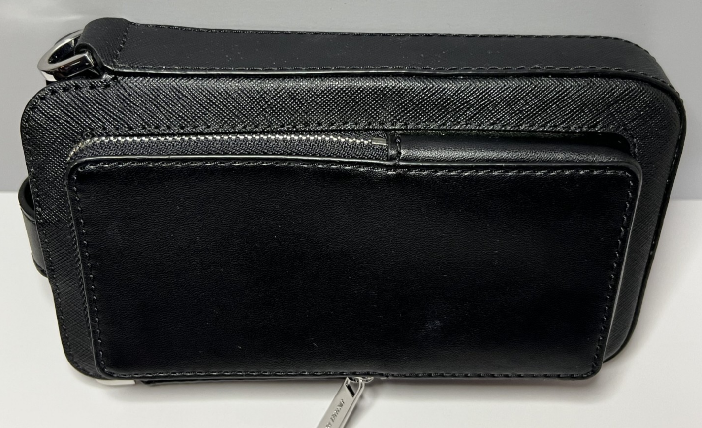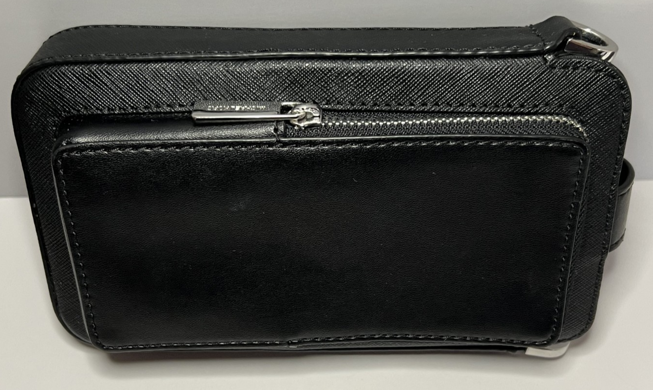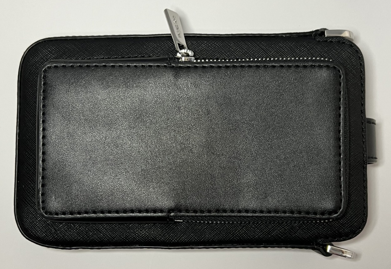 Michael Kors Saffiano Leather Smartphone Crossbody Bag Line: Jet Set Travel Color: Black, Silver-tone Hardware Material: 100% Leather (exterior), Polyester (interior lining) Condition: Bag in great condition, missing adjustable strap and airpod case Features: Snap/Zip Fastening, Smartphone pocket, 6 Credit Card Sleeves Size: 4.5"x7.5"x1.75"