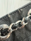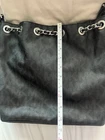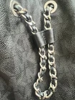 The Michael Kors Large Black Monogram Purse is a stylish shoulder bag with a rectangular shape and a large size, perfect for carrying all your essentials. The purse features a magnetic closure, silver hardware accents, and a black leather exterior with the signature Michael Kors logo pattern as well on the inside. It comes with a double black leather handles that have some wear to them and inner pockets for organization.