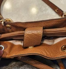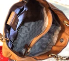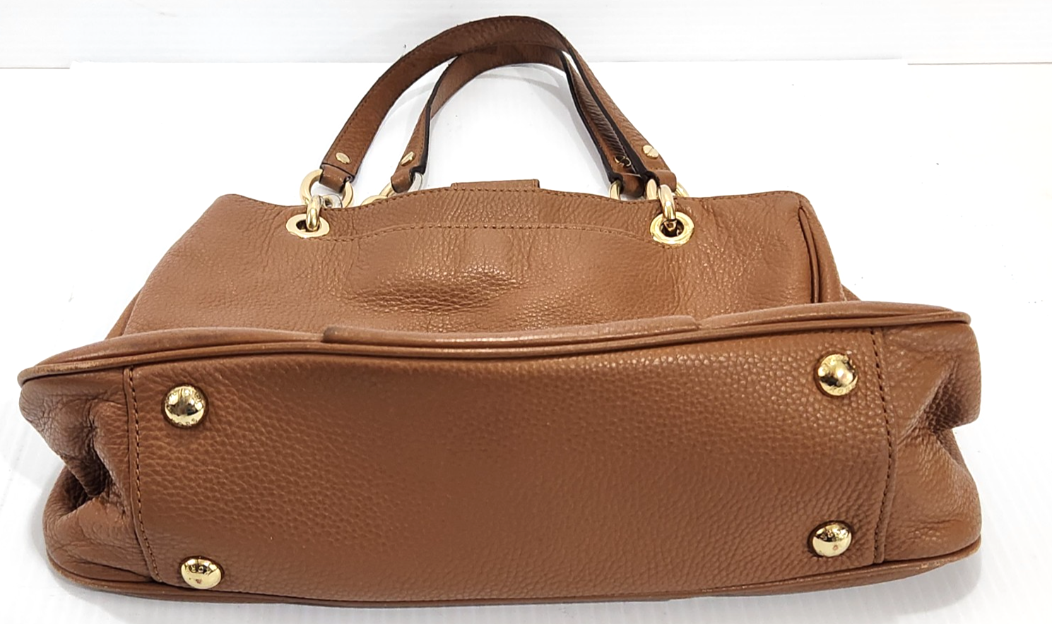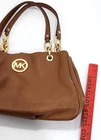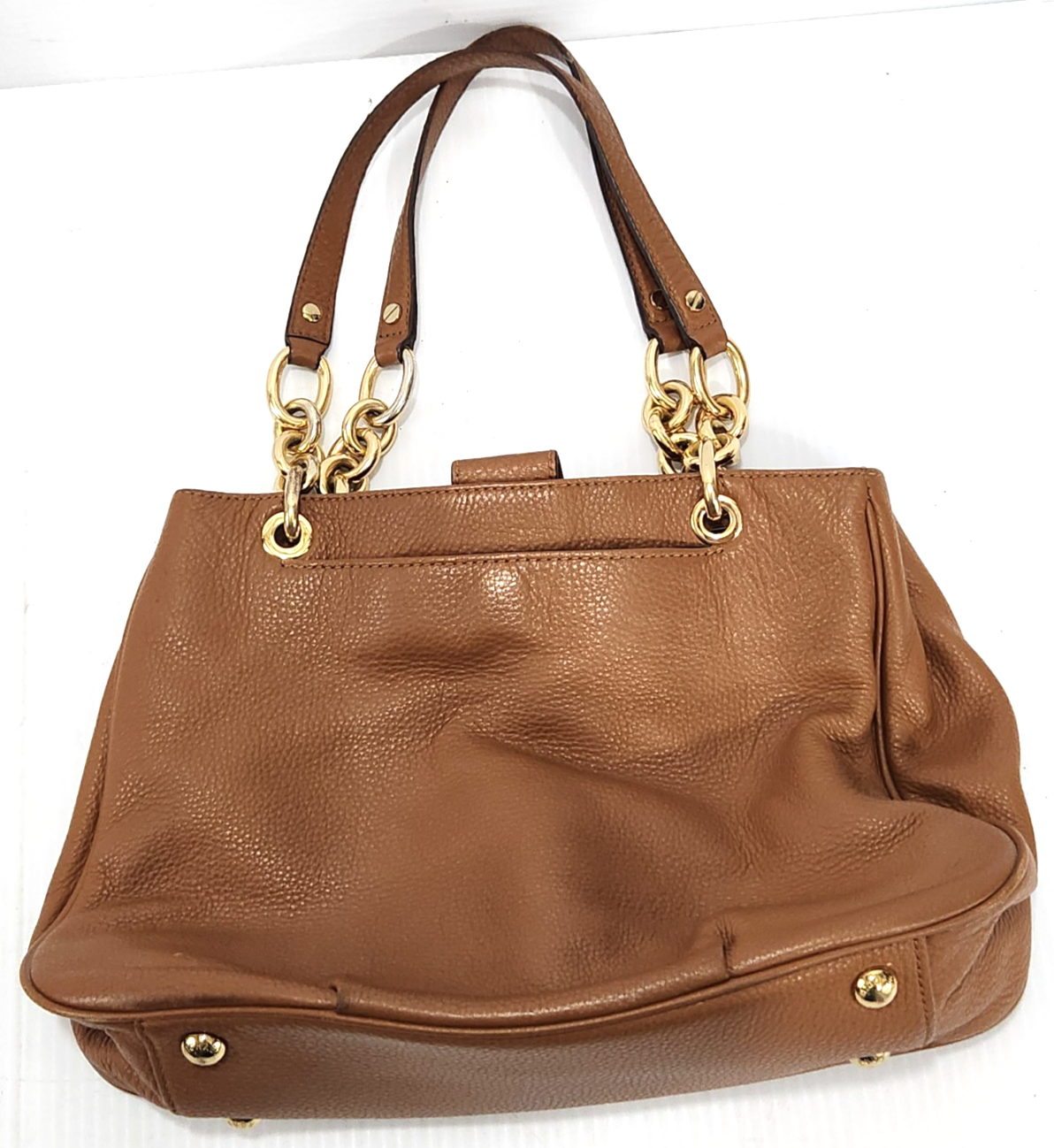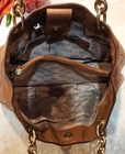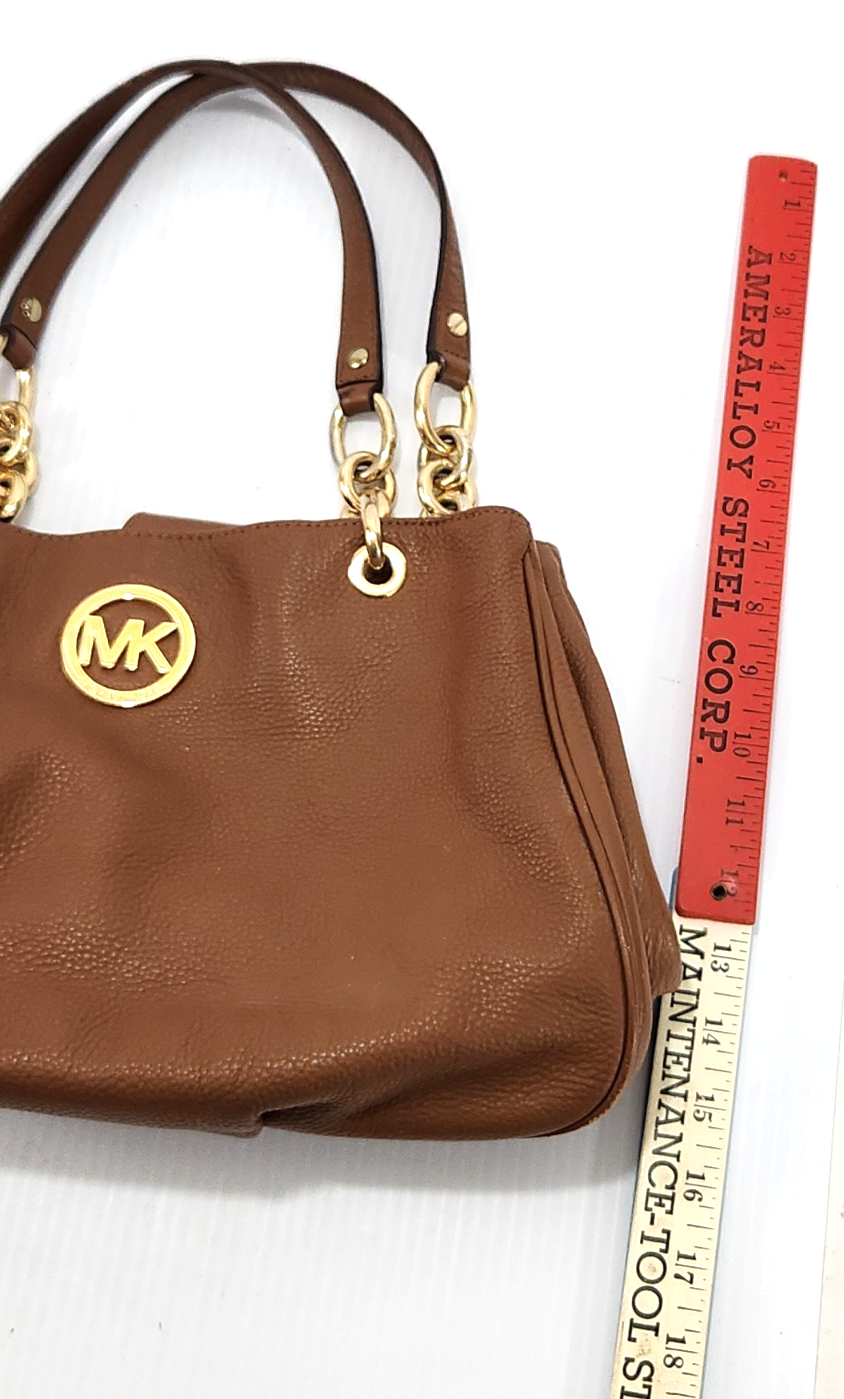 The Michael Kors Large Handbag is a stylish tote with brown pebble leather exterior and chain handles, perfect for women. The satchel/top handle bag features a beige lining and is made of high-quality leather with metal handles, providing a luxurious and practical accessory for everyday use or special occasions. This spacious handbag offers ample room for all your belongings while adding a touch of sophistication to your outfit.