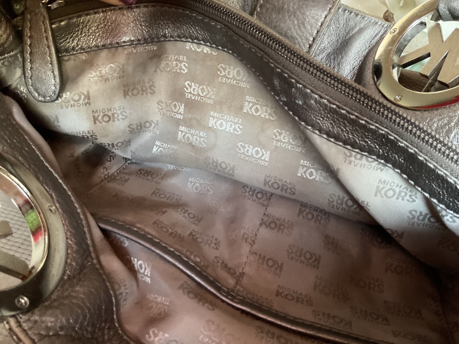 Preowned Michael Kors Silver Metallic Large Shoulder Bag, a blend of elegance and practicality. Crafted from premium leather, this bag boasts a chic metallic silver finish with a pebbled texture that adds a touch of sophistication. The spacious interior is lined with a contrasting gray fabric, ensuring your belongings are cushioned and organized in style. Designed for the fashion-forward woman, this shoulder bag features a sturdy double handle in metallic silver that complements the bag's shimmering exterior. The roomy dimensions, with a width of 15 inches, height of 11 inches, and depth of 5 inches, provide ample space for your essentials. The bag's solid pattern, magnetic snap closure, and silver hardware contribute to its sleek and modern silhouette. There are 3 compartments to this bag, including a zippered middle compartment for laptop or iPad, 4 slip pockets, bottom studs and a zippered compartment, this bag is very roomy for all your stuff! Inside needs a little cleaning. Comes from a smoke and pet free home 🏡 Combine shipping available. All items are inspected before shipping 🚐