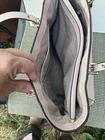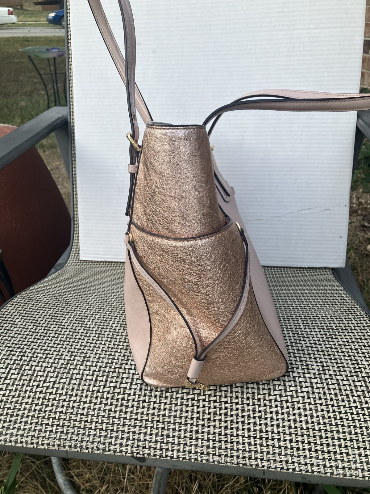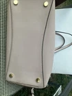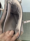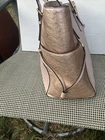 This Michael Kors tote bag is a stylish accessory for any occasion. With a rectangular shape and a zip closure, this bag is perfect for travel, weddings, parties, or even as an everyday workwear or business accessory. The exterior is made of coated leather in a tan and light copper color, while the interior lining is a matching tan fabric. The bag features an adjustable shoulder strap, gold-plated hardware, and two pockets for added convenience. Although the metal stands show some light wear, this bag is still a great choice for anyone looking for a designer accessory. The tote bag is large in size, with a width of 12 inches, a height of 10 inches, and a depth of 7 inches.