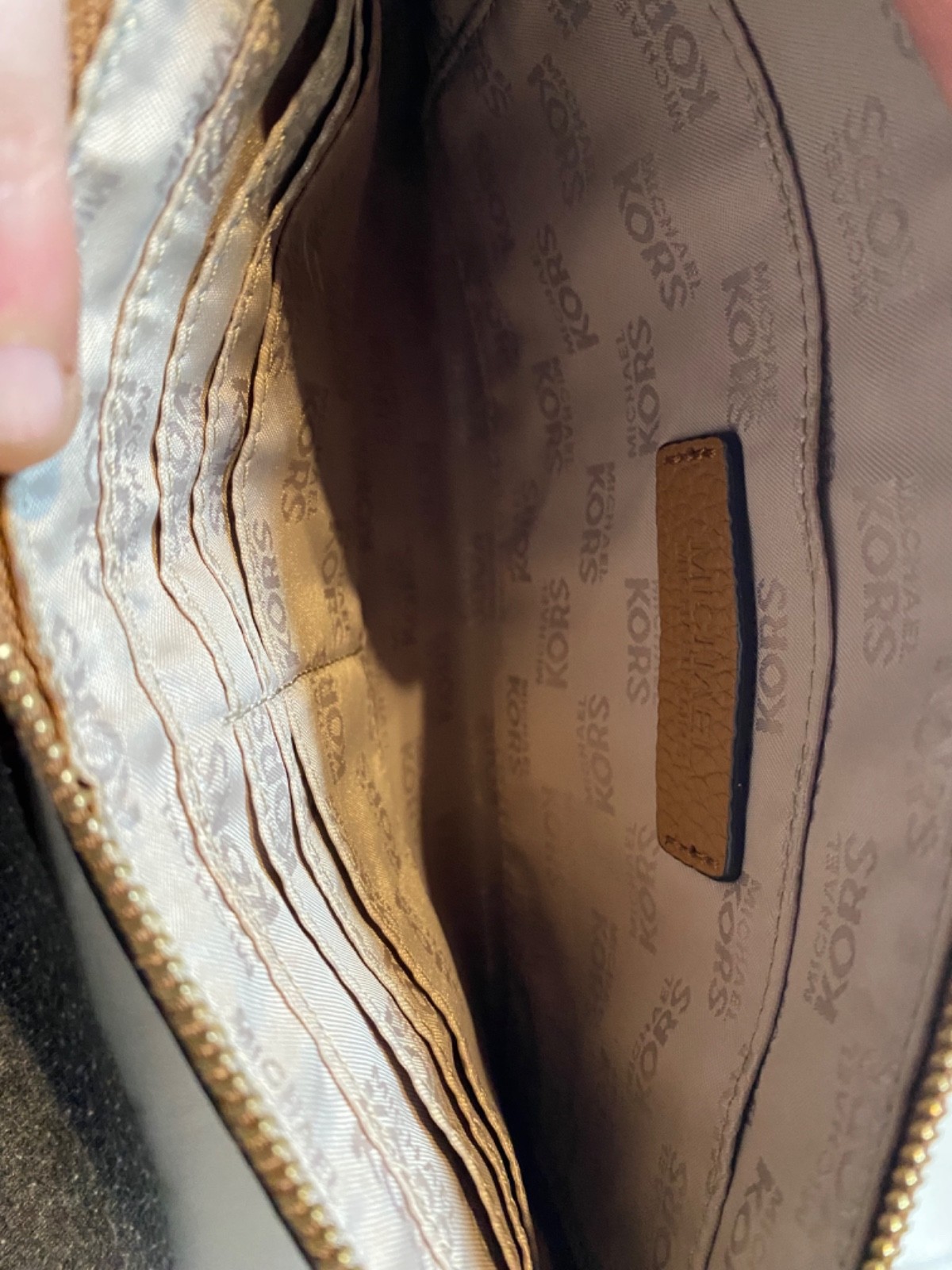 Michael Kors Leather Clutch/Wristlet/Wallet 9.75”x 5.5” Fabric lining 6 card slots and a checkbook pouch 5.5” handle drop A few small scratches on the Michael kors emblem.