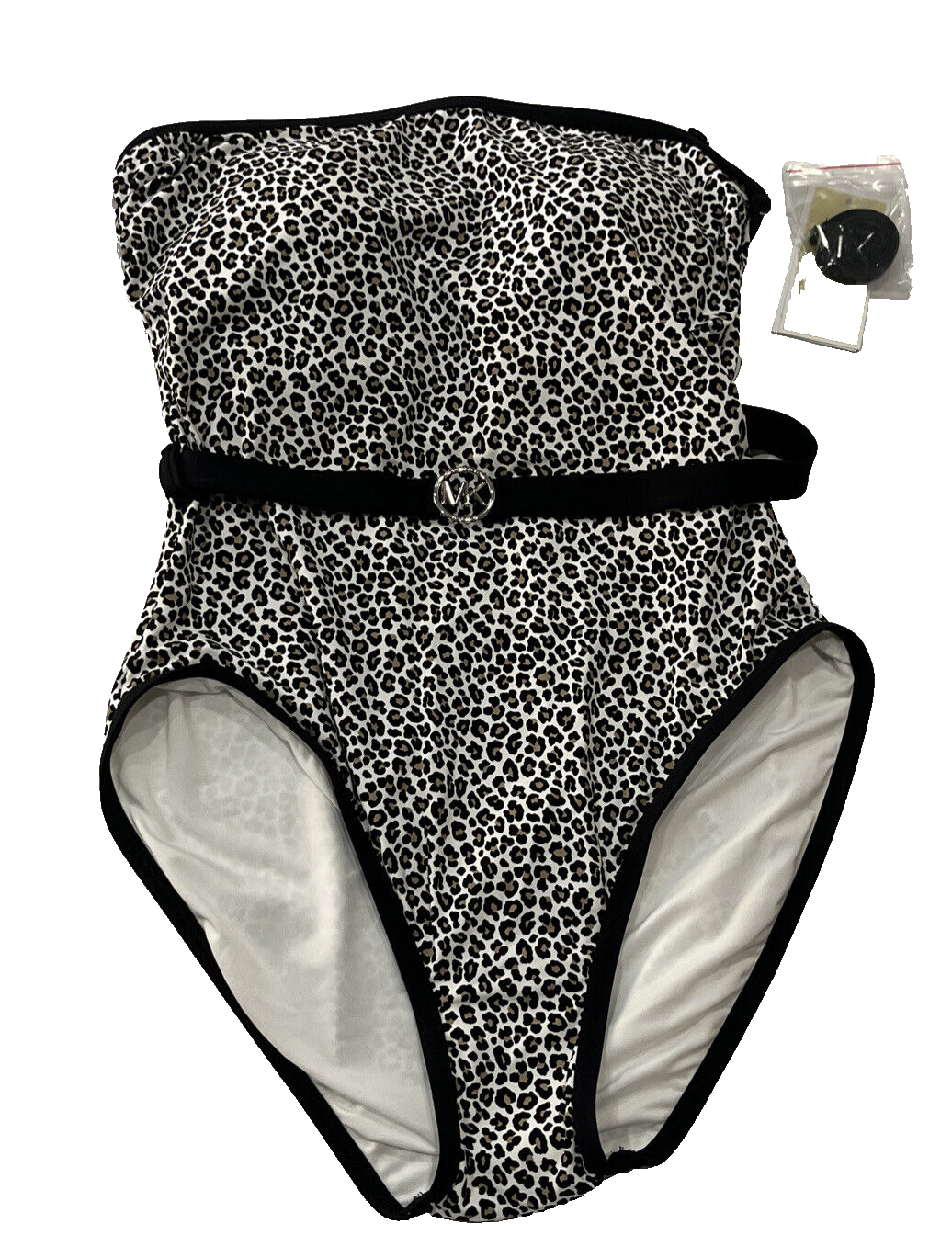 Michael Kors Logo-Belt Bandeau One-Piece Swimsuit size: 10 color: Black / Tan Bandeau neckline Removable soft cups with underwire Lined Attached belt with gold logo detail Pull-on style Optional strap Full bottom coverage Nylon/ spandex blend retail $126 K48